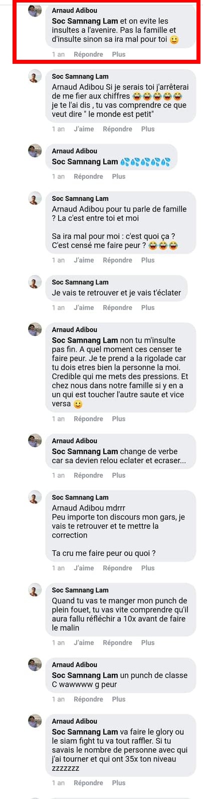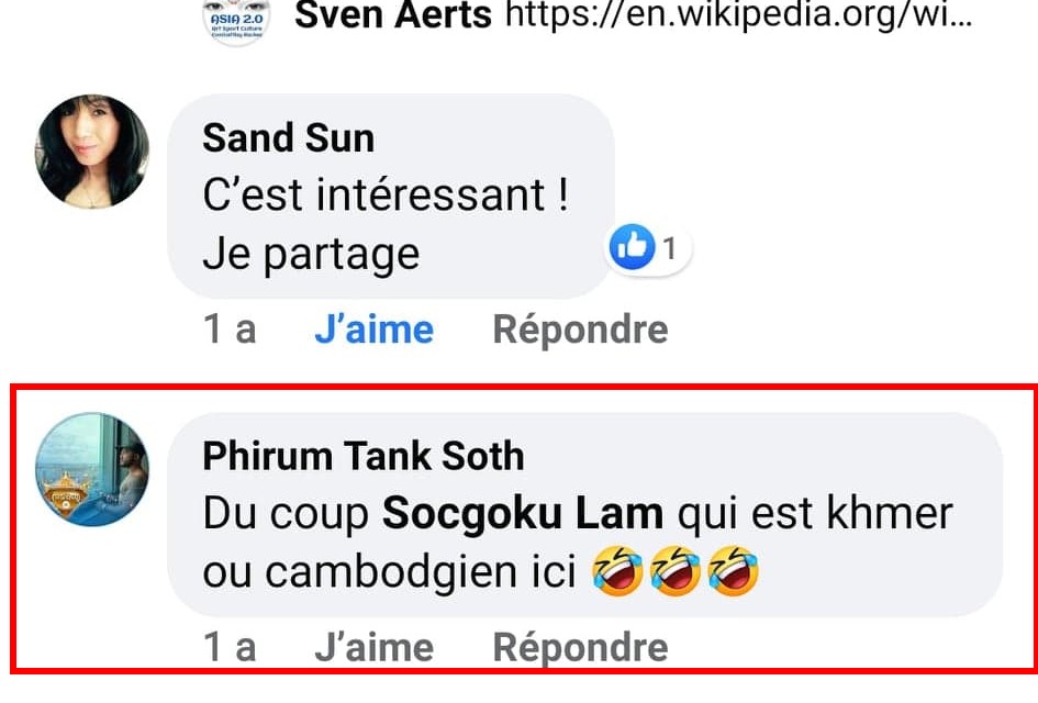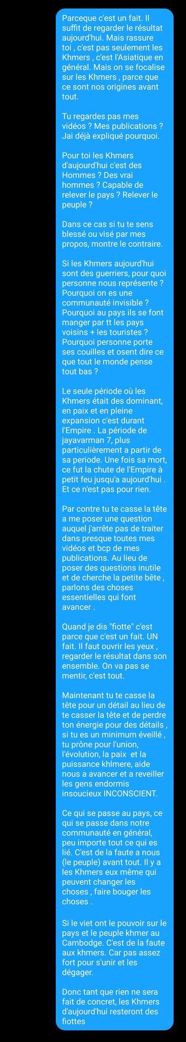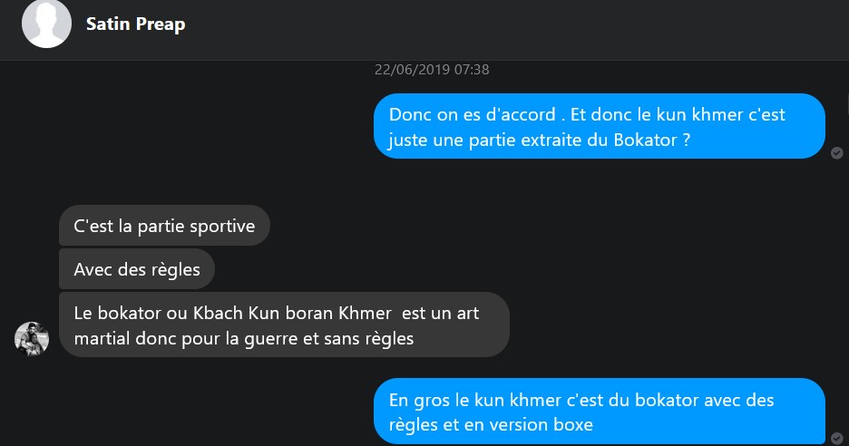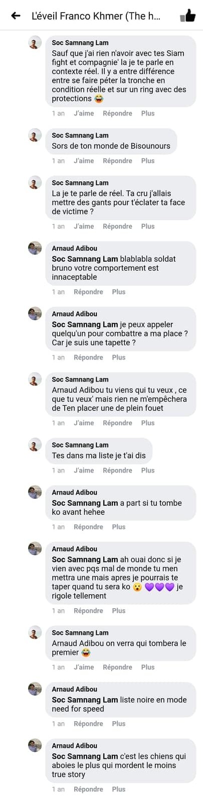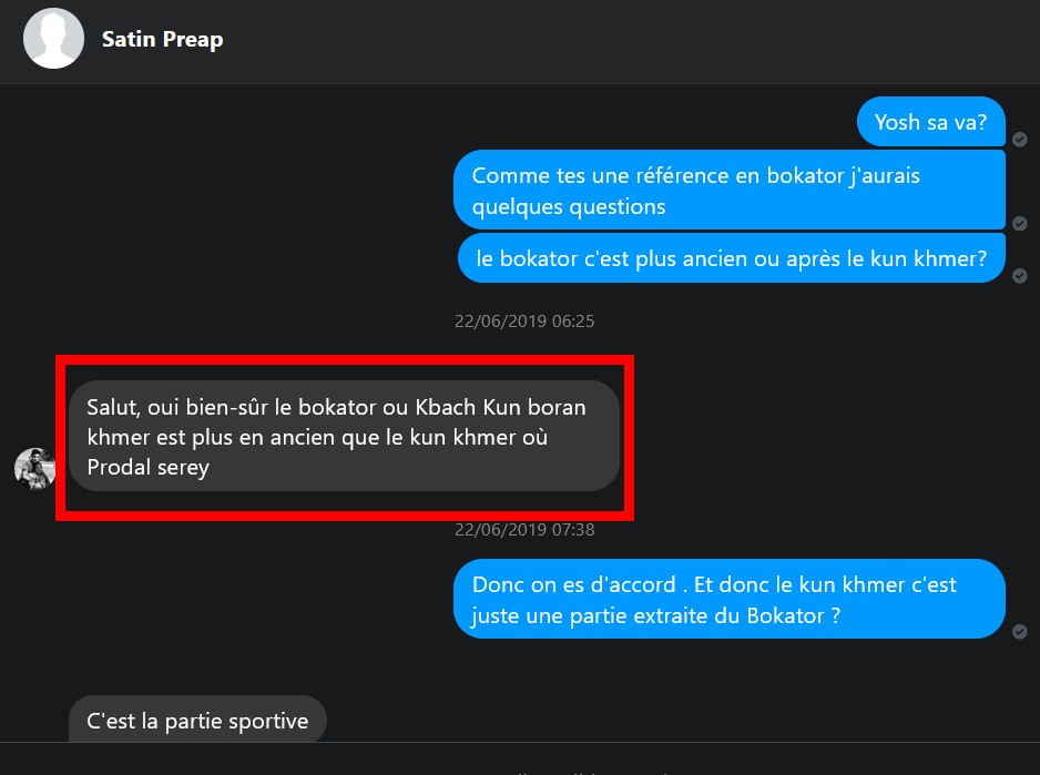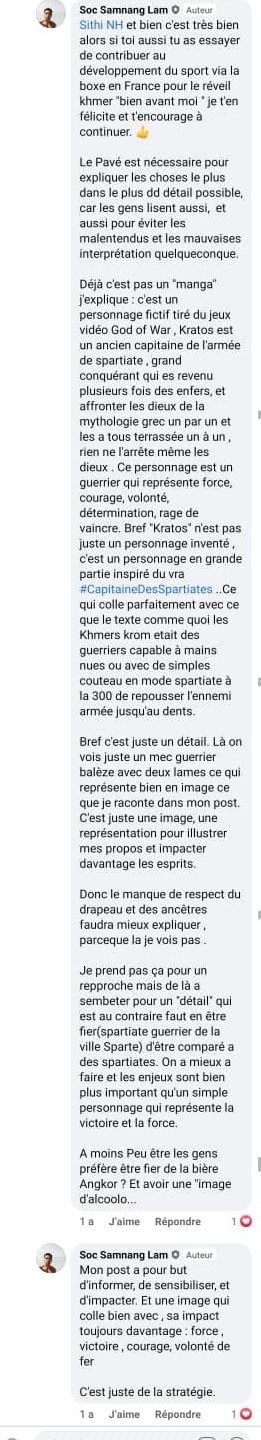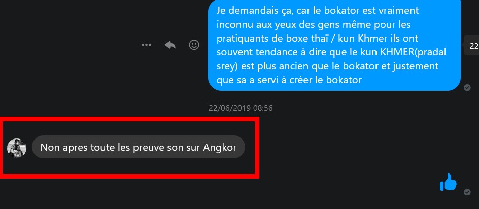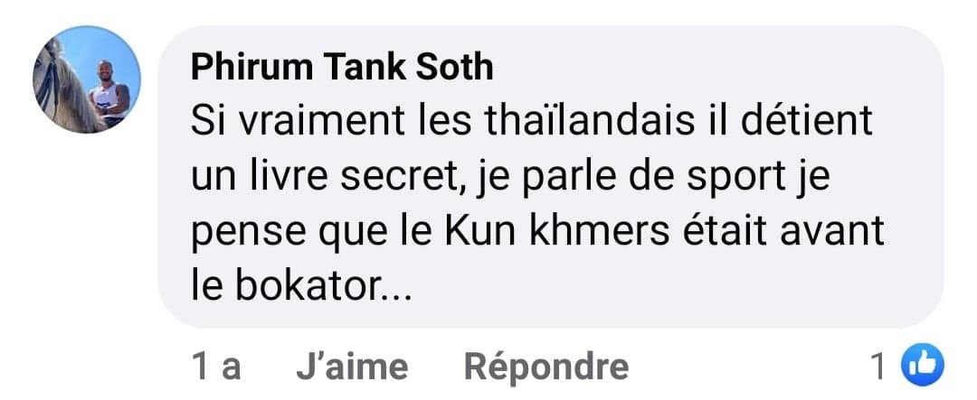 C'était une publication où on parlait du pillage et de l'appropriation de la culture khmer par la Thaïlande, j'avais mentionné rapidement comme quoi le bokator l'art martial khmer c'est avant le kun khmer, et que le bokator c'est l'ancêtre du kun khmer (boxe khmer). Mais enfin bref, c'était même pas le sujet principal, mais lui, comme à son habitude, toujours à chercher la petite bête avec ses remarques pour tenter de me casser à la moindre opportunité. Il disait que le bokator c'est après le kun khmer. Franchement ca c'était pas le soucis, on pouvait débattre sans problème.