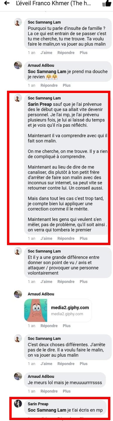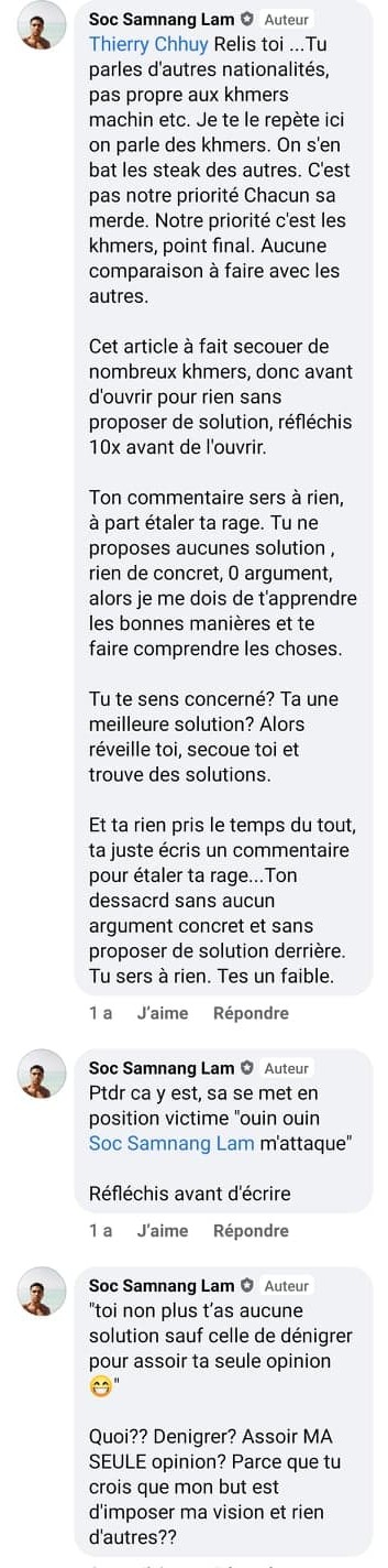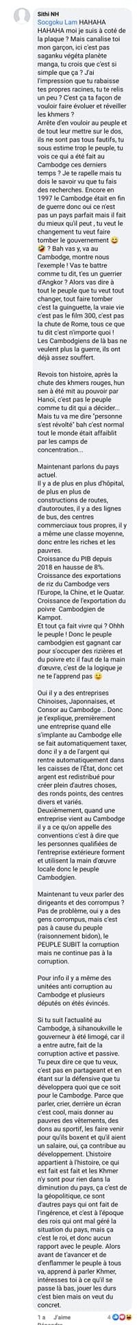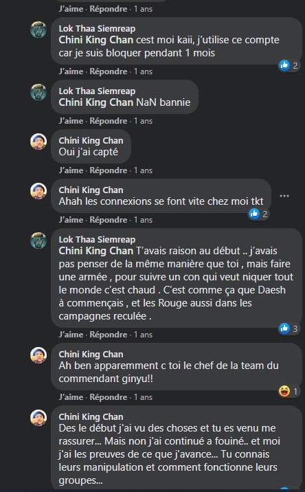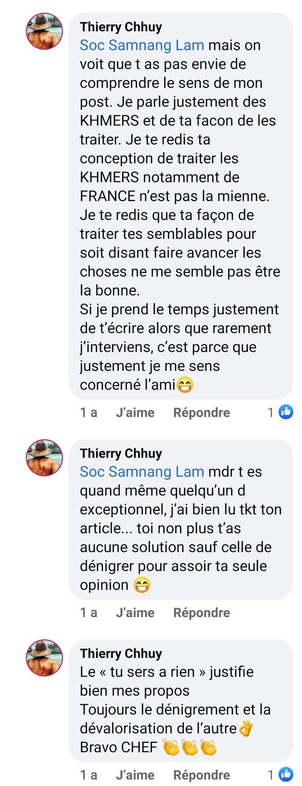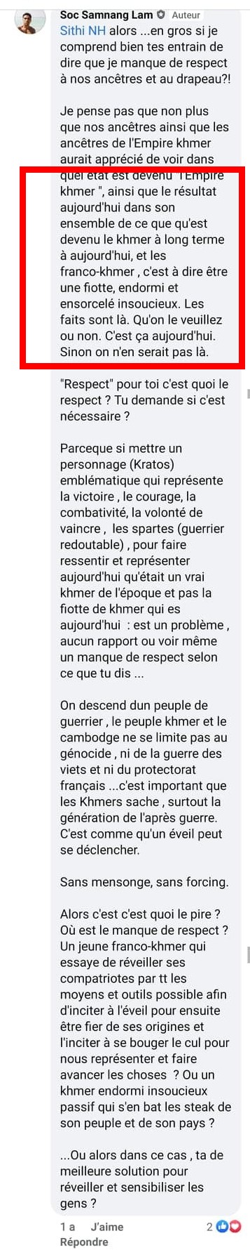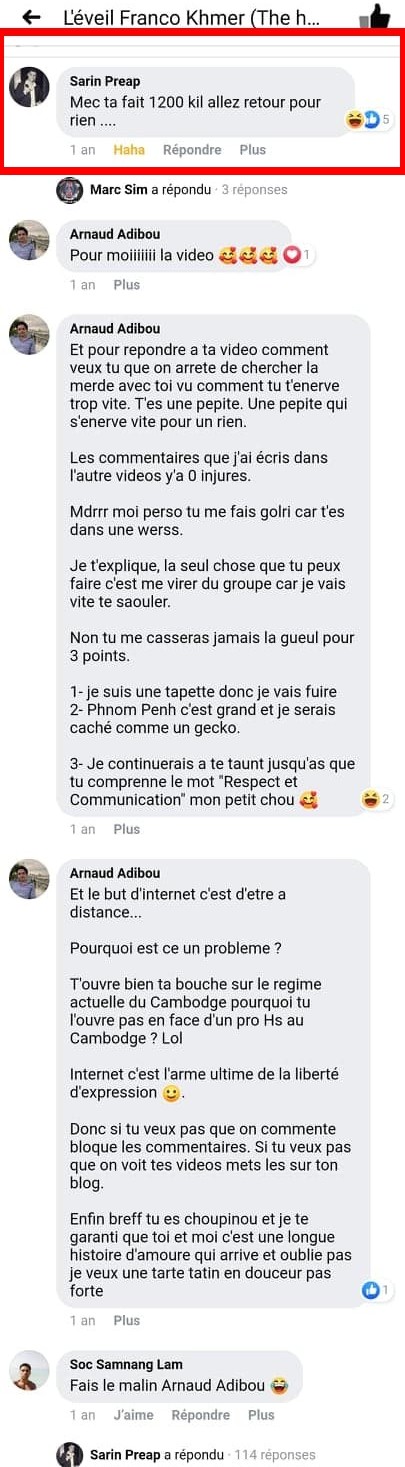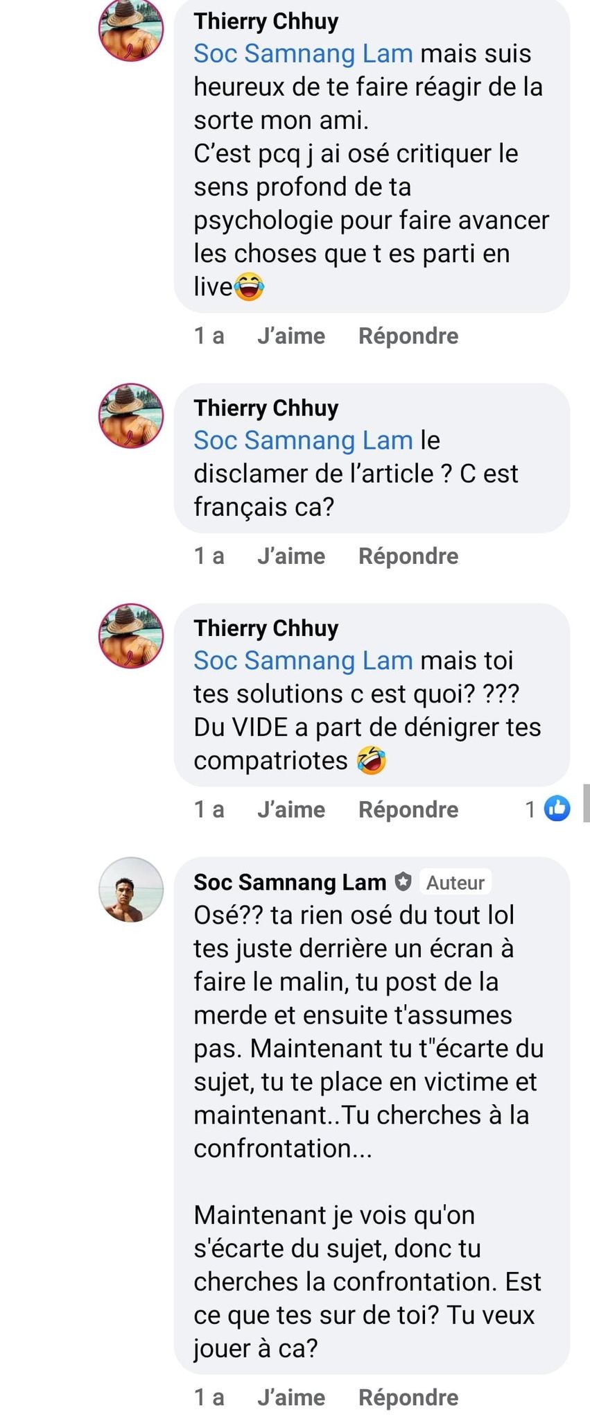 C'est à cette période moment là que le Phirum commençait à montrer de plus en plus son visage toujours en cherchant à troller "gentiment" toujours un pic de provocation, avec ces genres de commentaire suivants sur l'éveil Franco Khmer et toujours dans mes propres publications :
