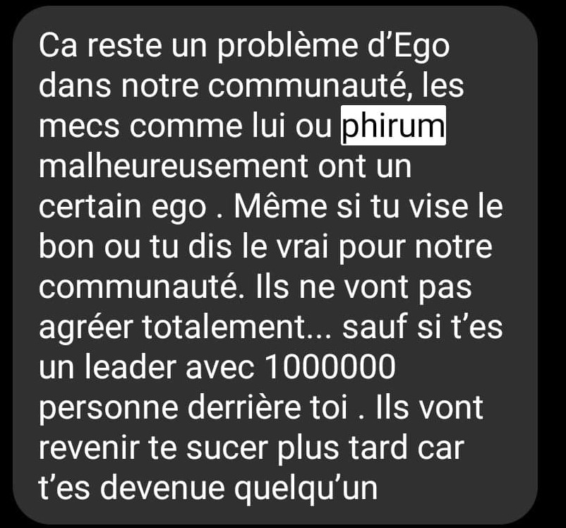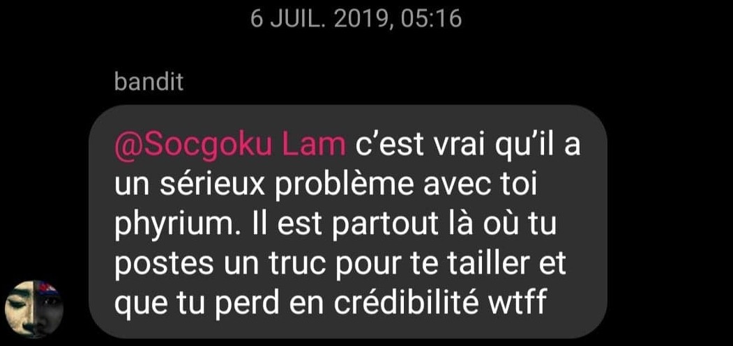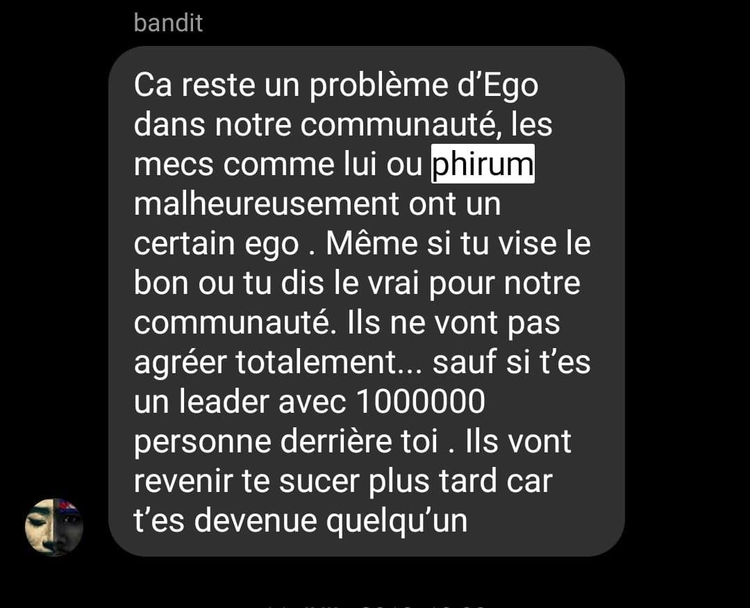 Là clairement on voit que j'en avais raz le cul. Il faut savoir que bien avant ça, j'avais contacté en privé Phirum pour lui demander si il avait un réel problème avec moi(ce qu'on nous allons voir par la suite) pour trouver un terrain d'entente et eviter tout mal entendu.
