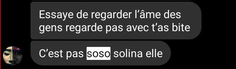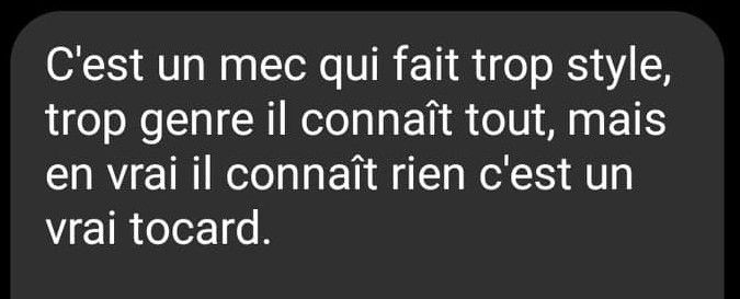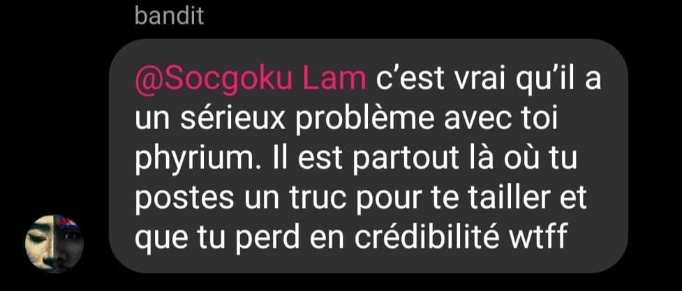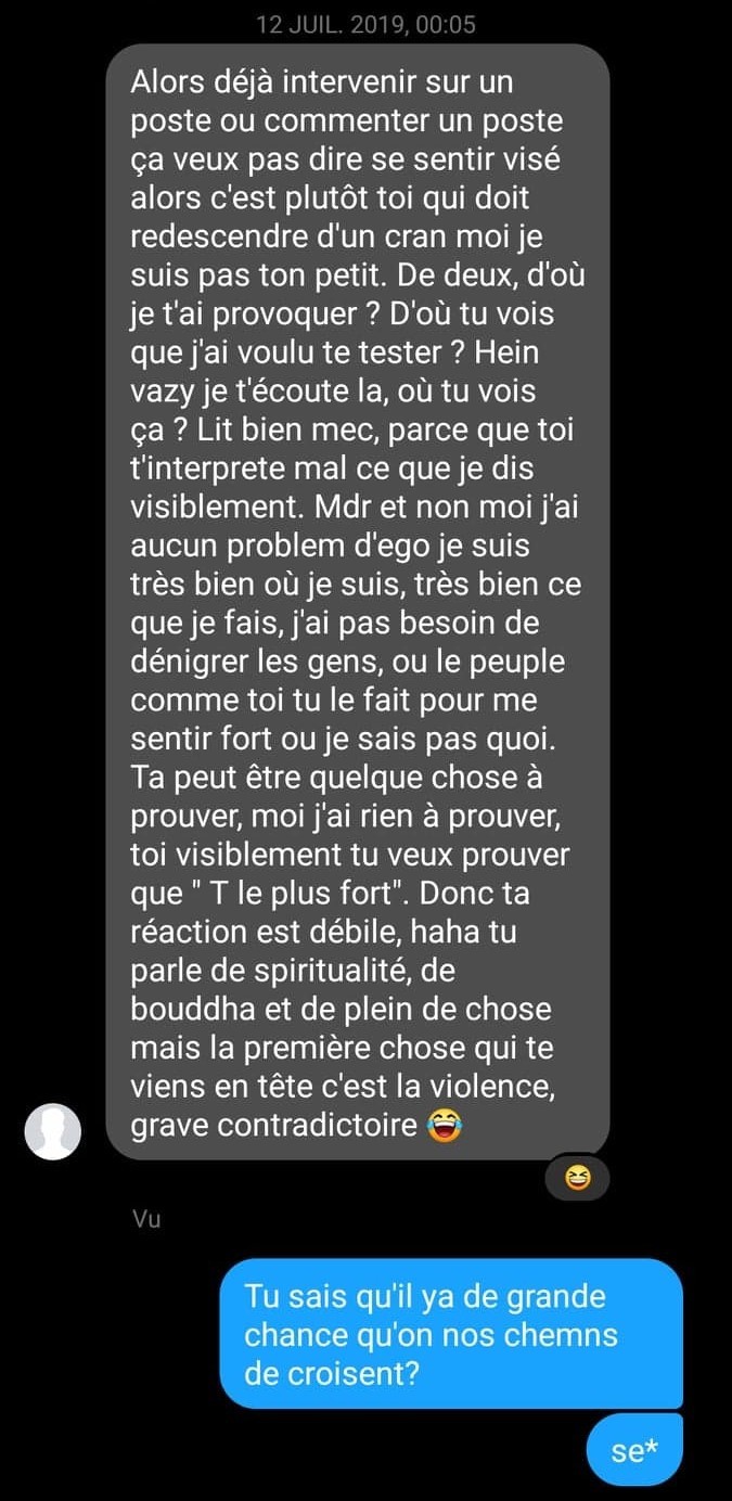 On voit clairement que ce mec m'observe depuis un momnt, me traque dans chaque pubication, toujours souvent pour dire de la merde sans argumentation constructive, seulement pour essayer de me troller/tacler/casser peu importe comment tu appelle ça, mais il faut avoir de la merde dans les yeux et être dans le déni pour ne pas remarquer qu'il cherche depuis un bon moment à me tacler et à me provoquer de façon subtile et discrète pour que sa passe inaperçu aux yeux des autres.