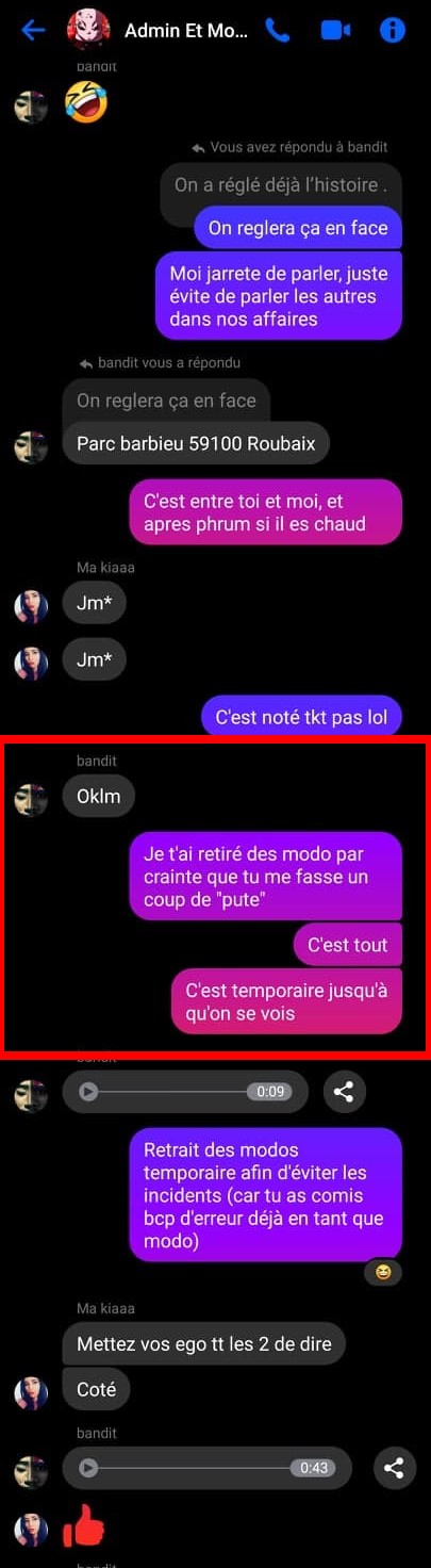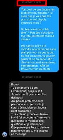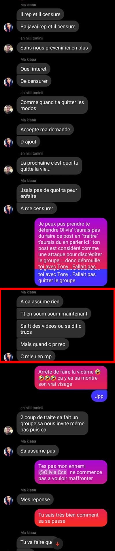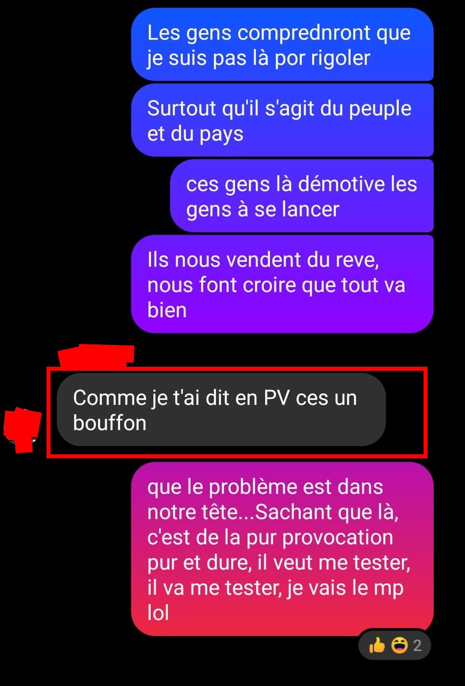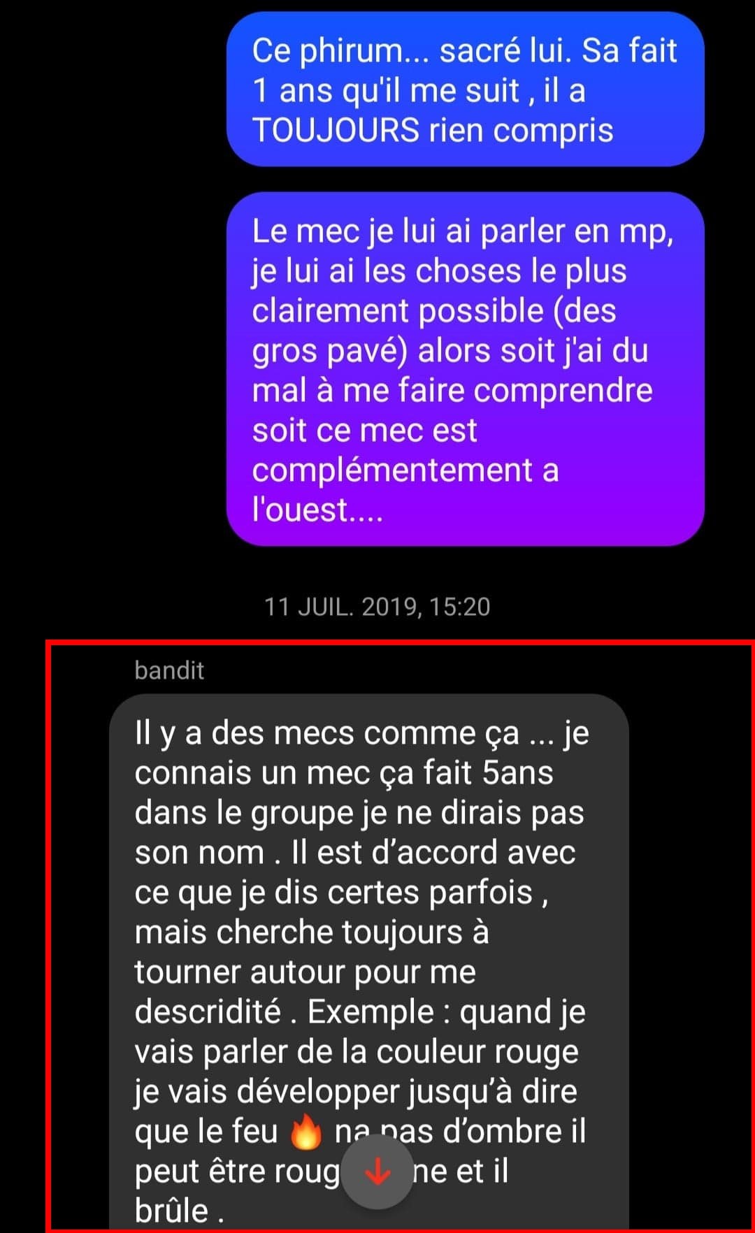 Ce qui est entouré en rouge, montre clairement une sorte de rancune / méprise, ou peu importe comment on appelle ça, mais on voit bien à travers son message (voir ce qui es entouré en rouge)