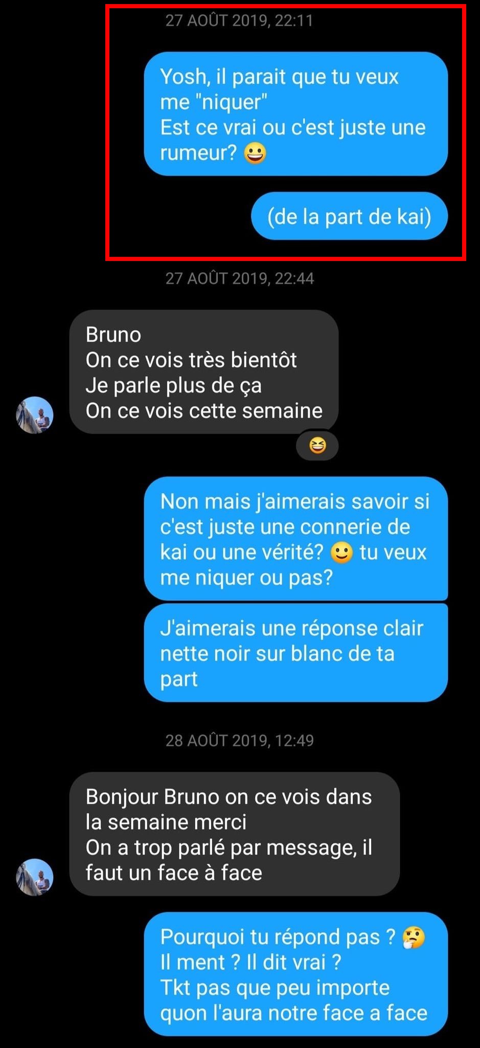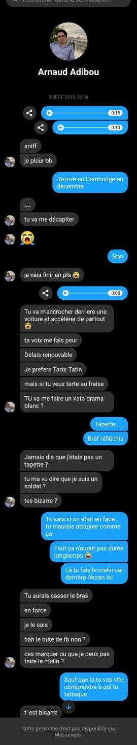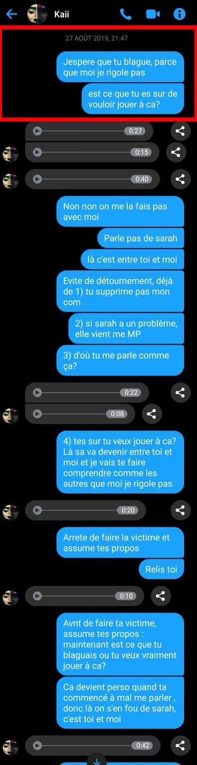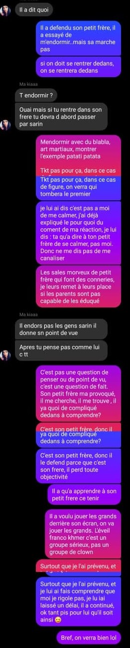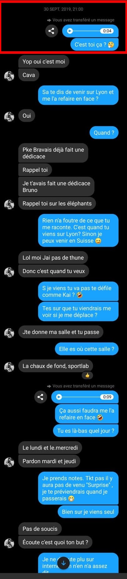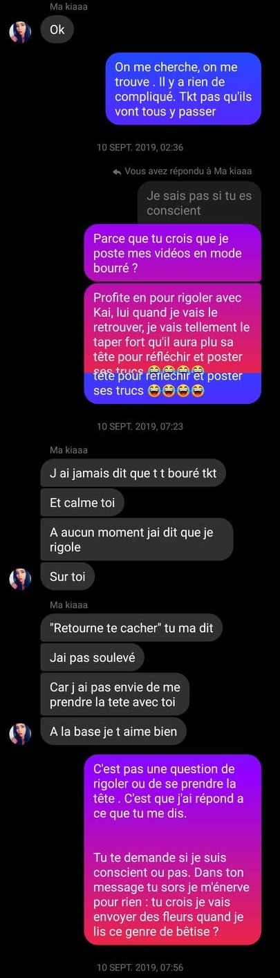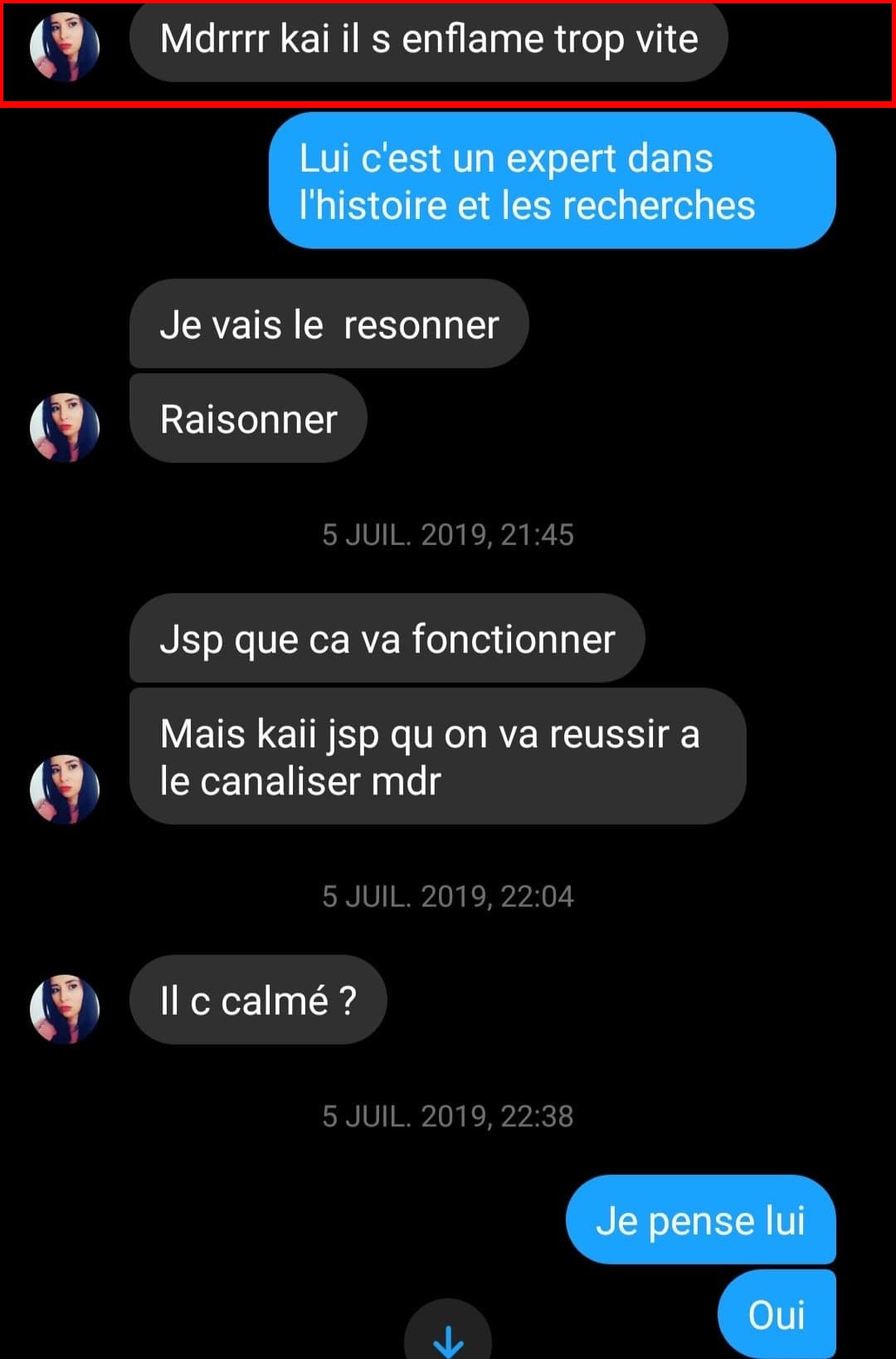 Voici quelques aperçu de message (sur messenger, je suis en bleu, en noir c'est Kai)