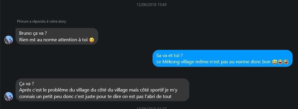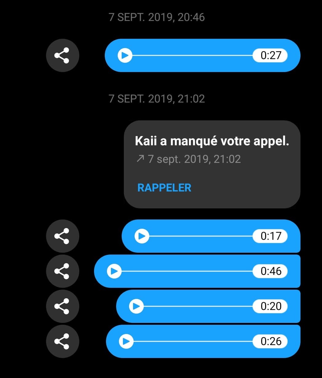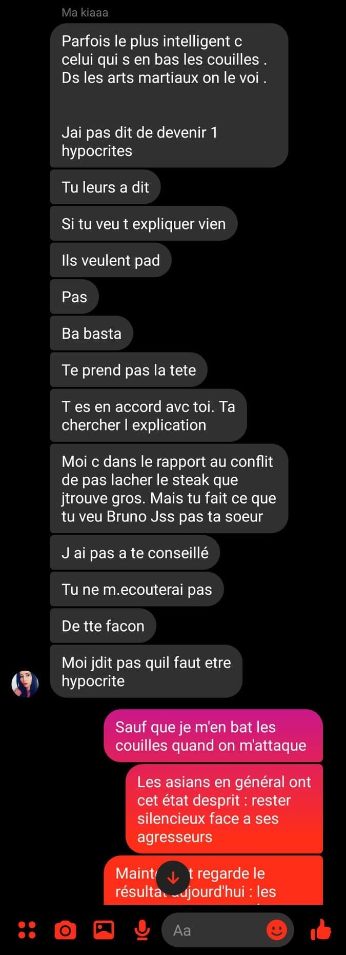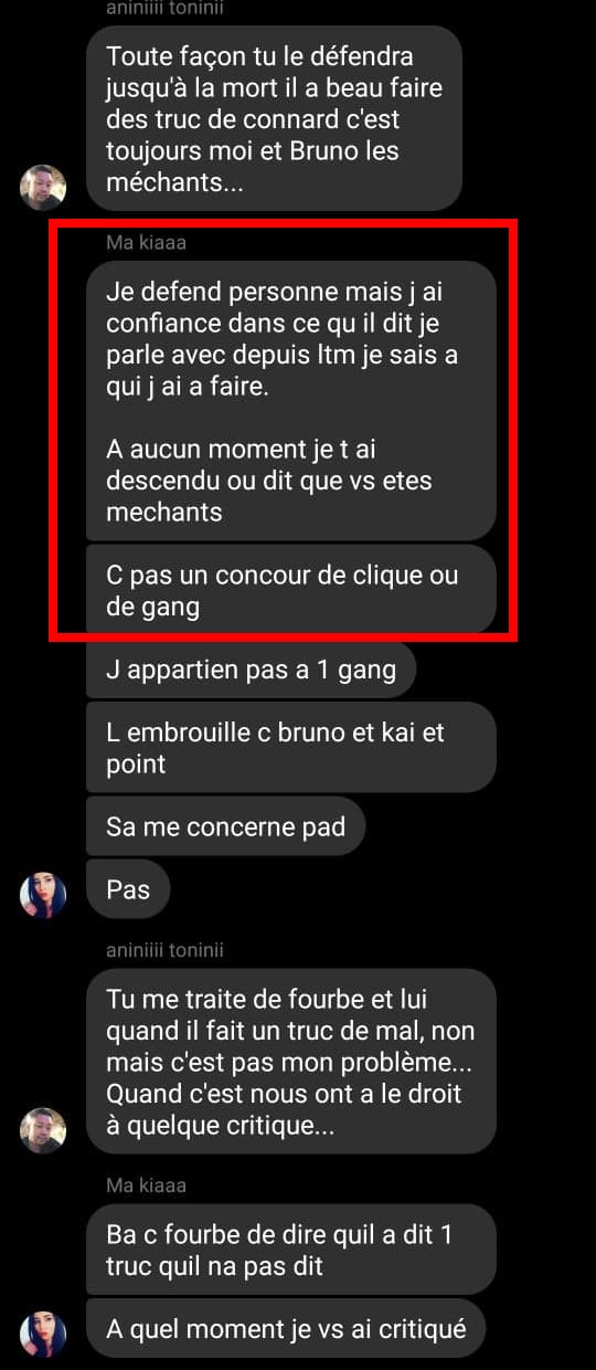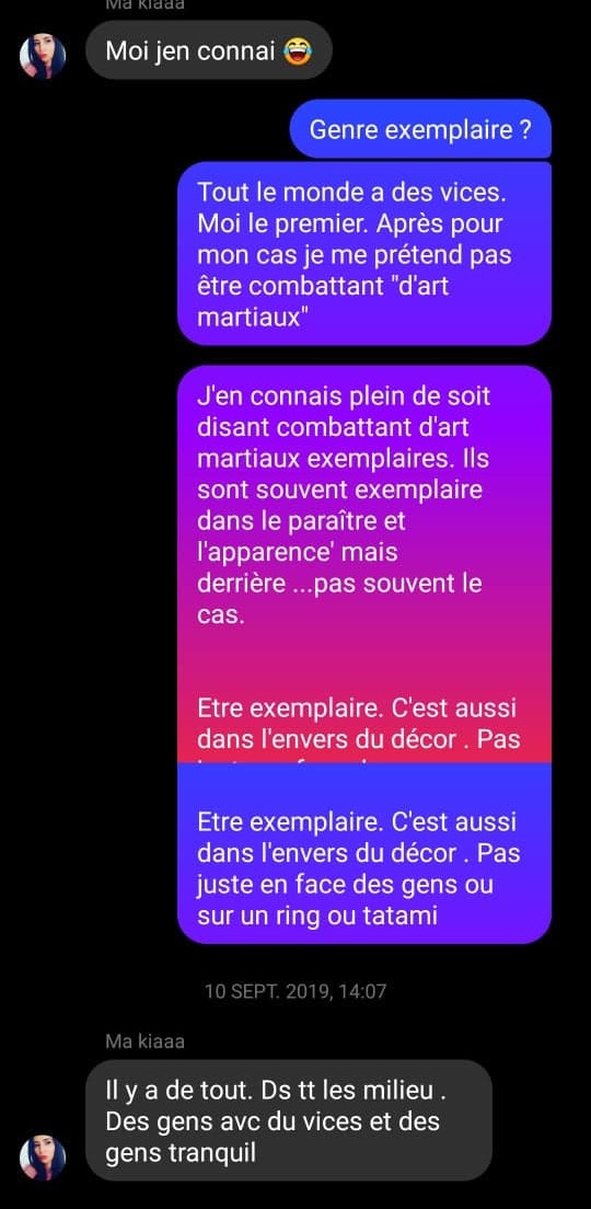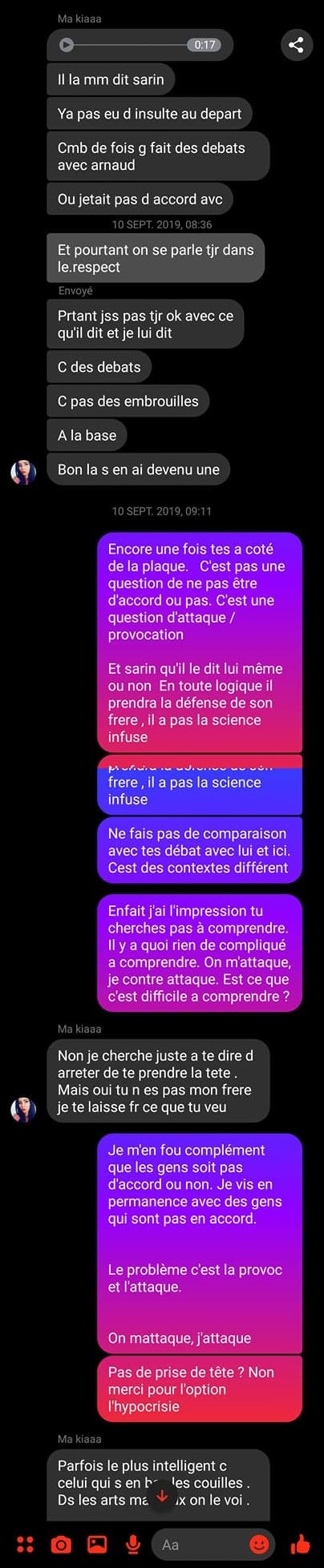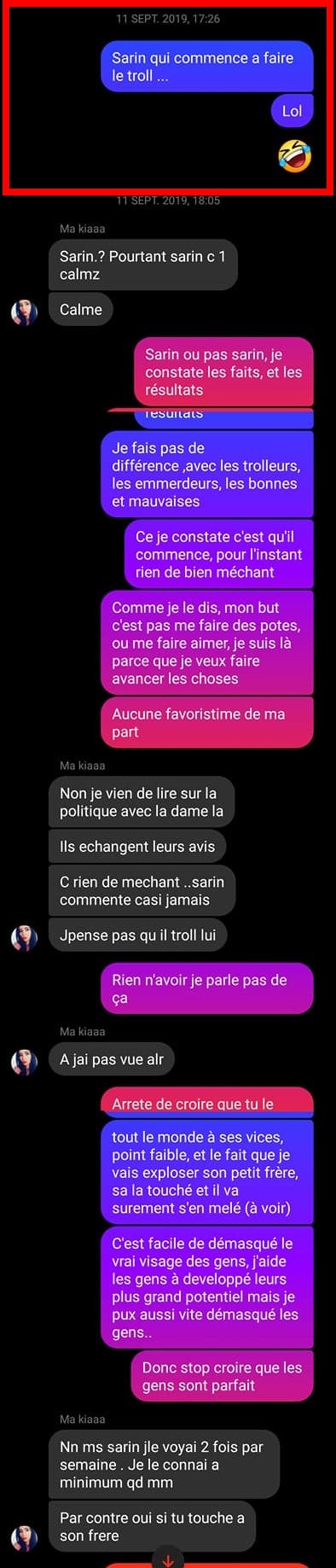Voici quelques aperçu de message (sur messenger, je suis en bleu, en noir c'est Kai)