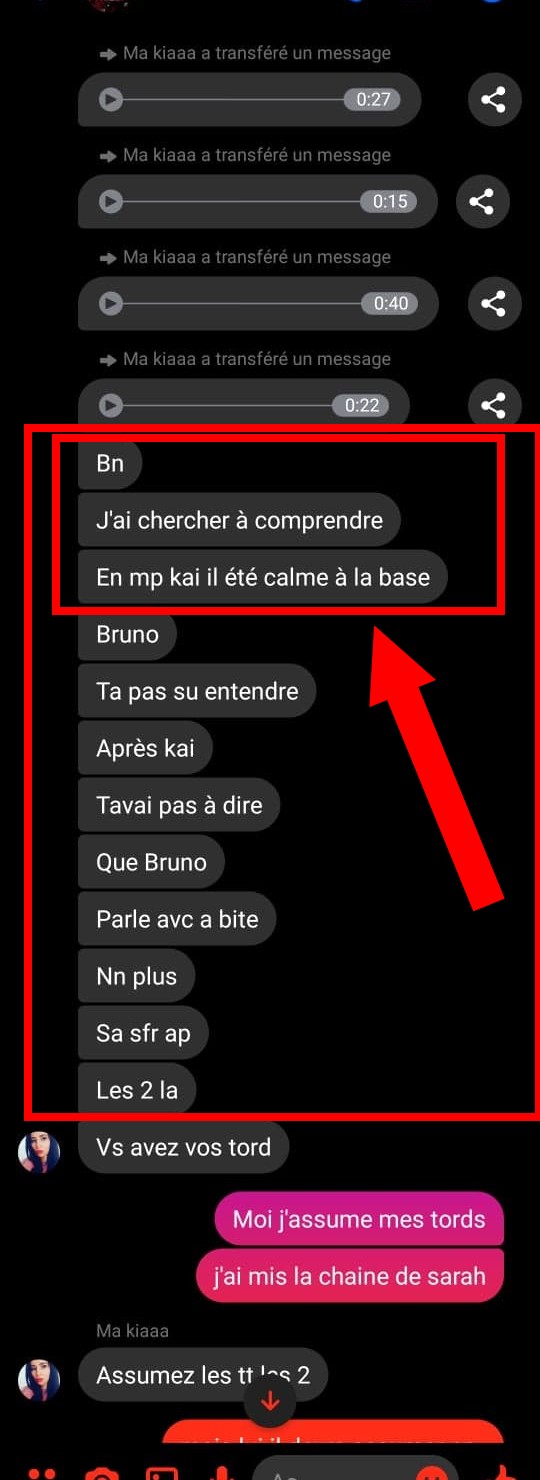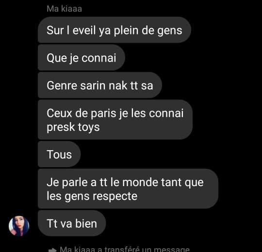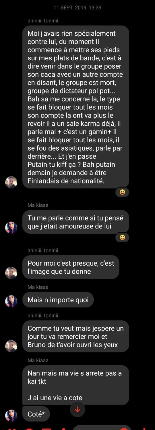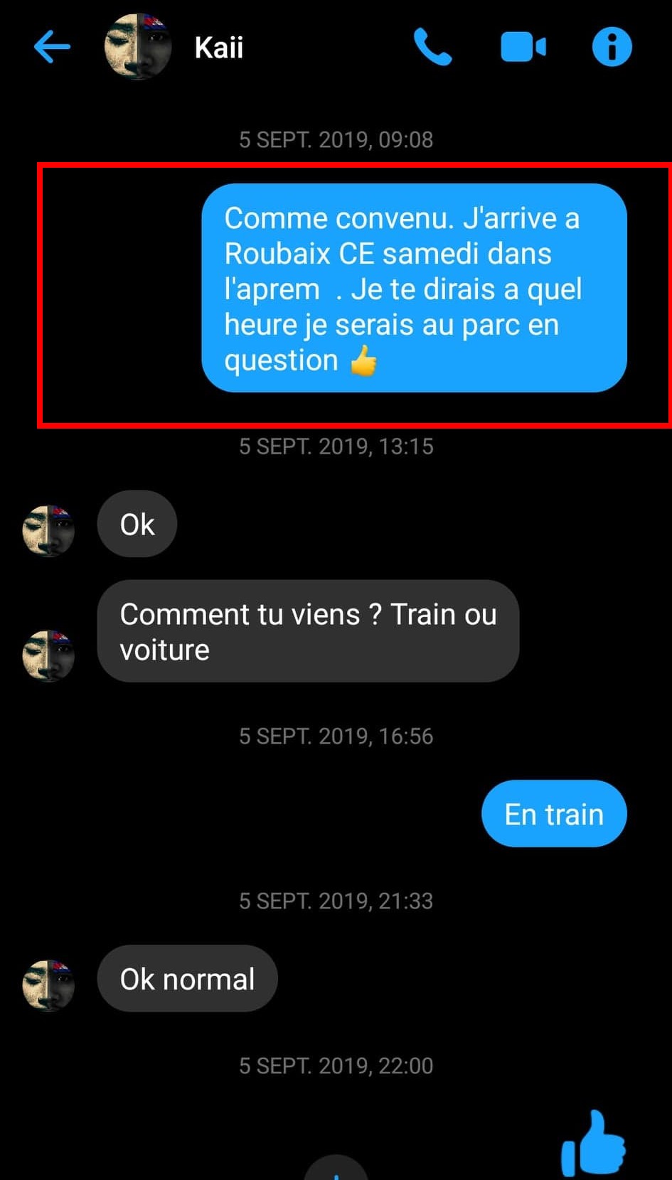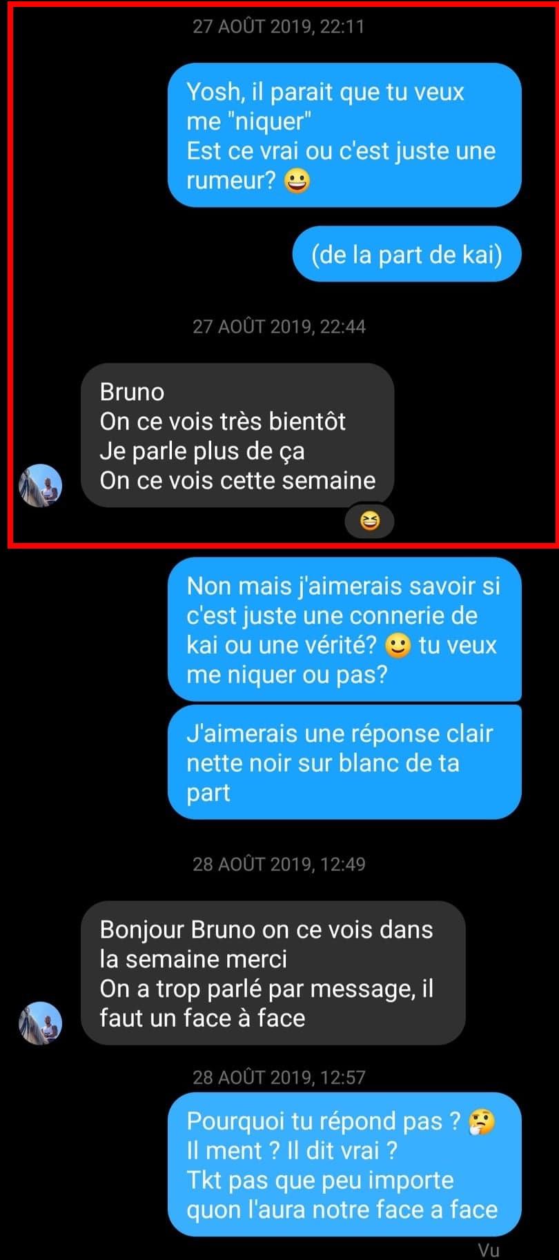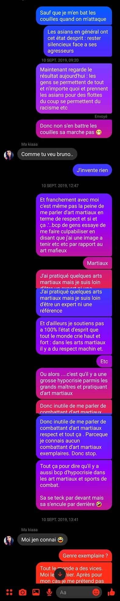 Voici quelques aperçu de message (sur messenger, je suis en bleu, en noir c'est Kai)