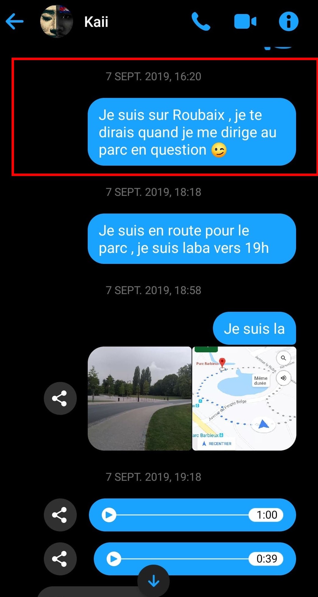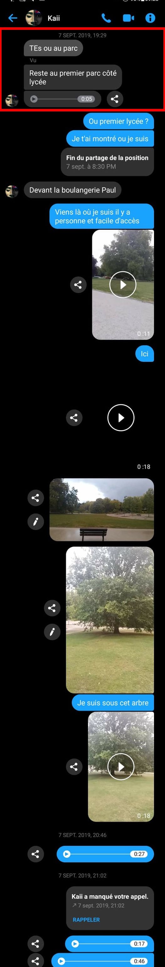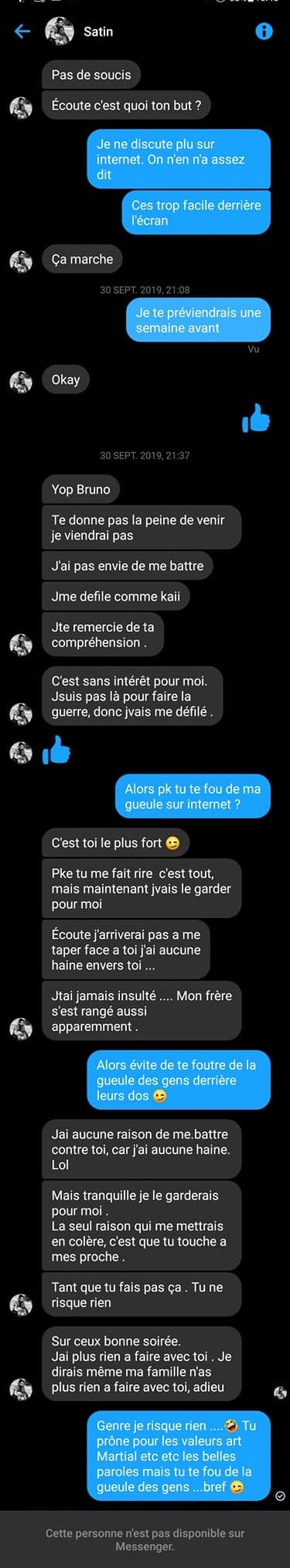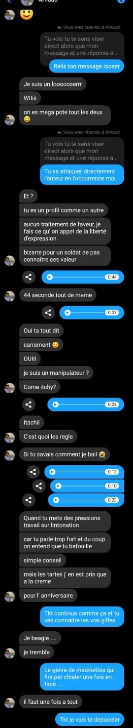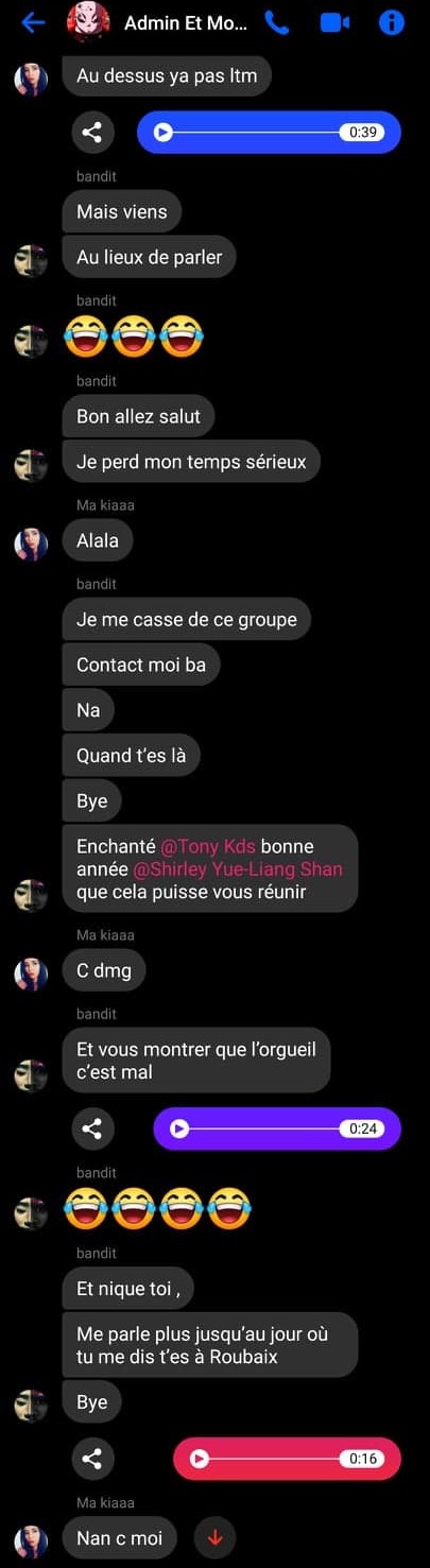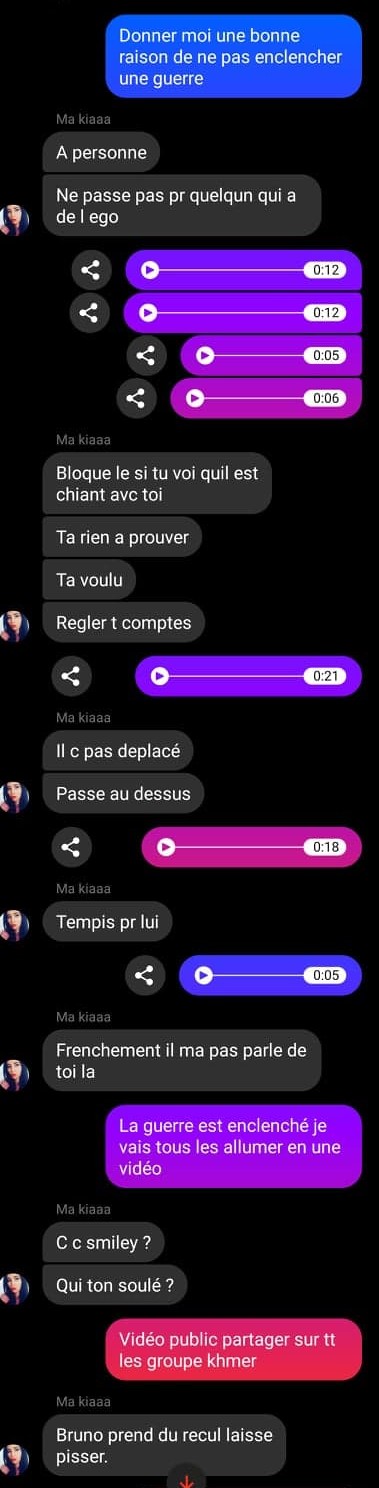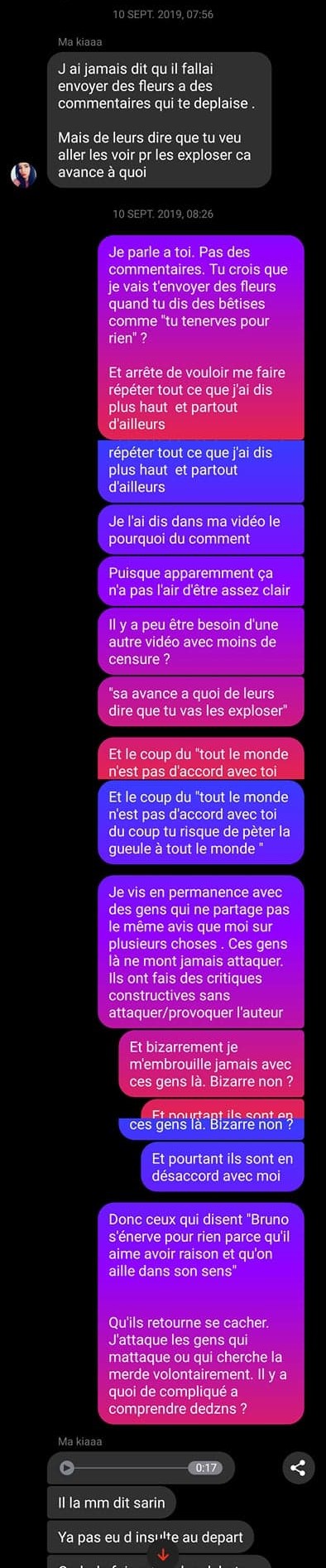 Voici quelques aperçu de message (sur messenger, je suis en bleu, en noir c'est Kai)