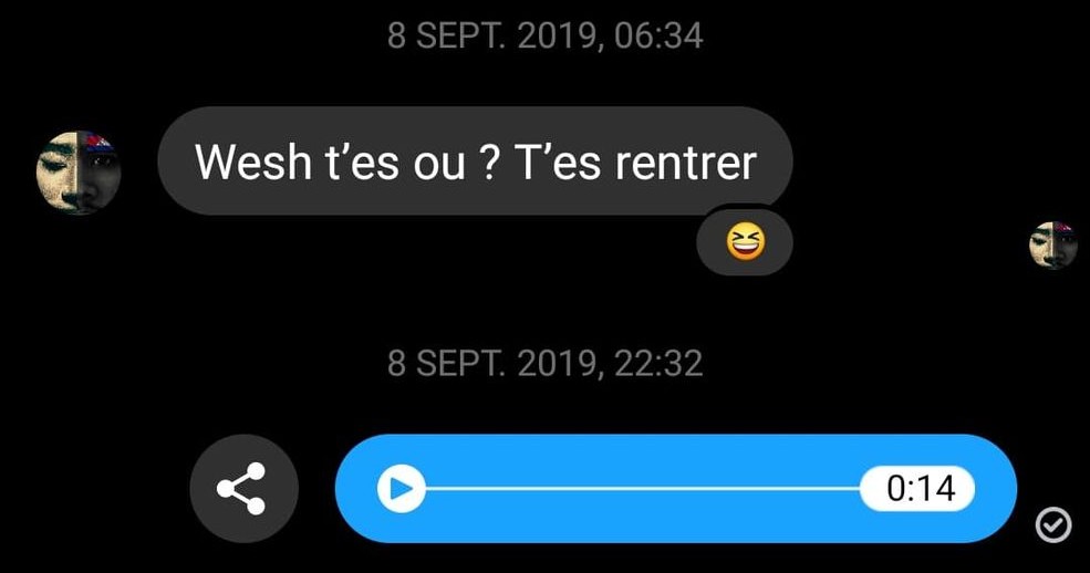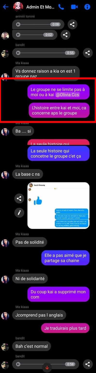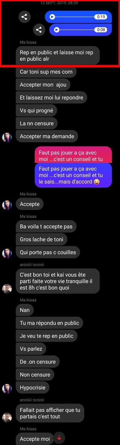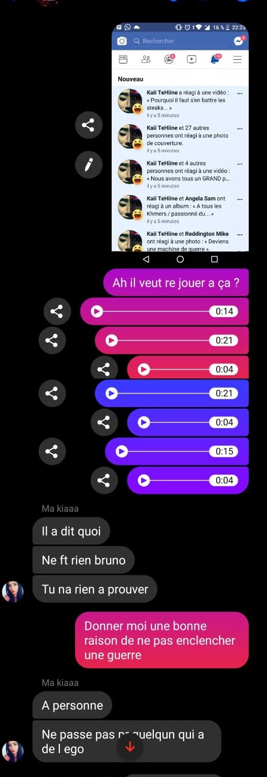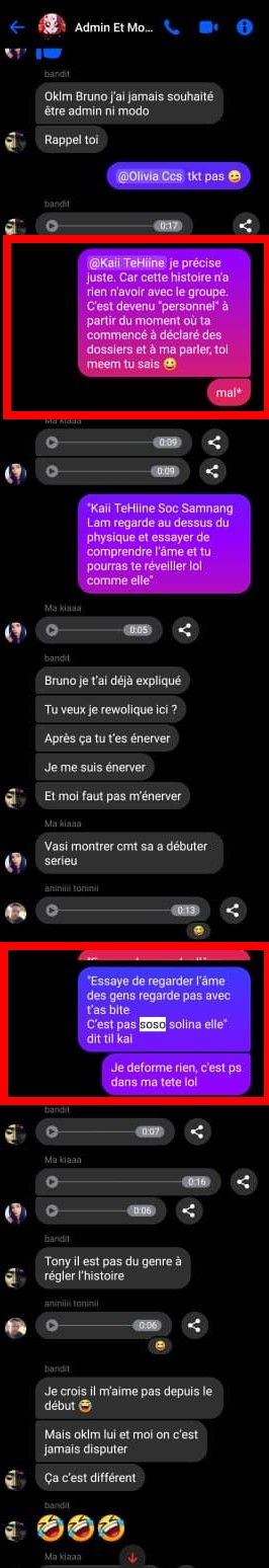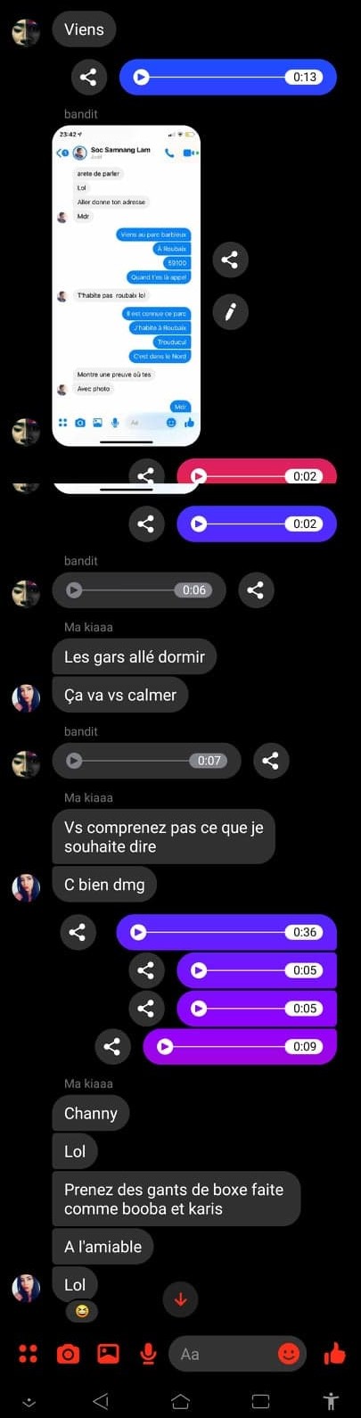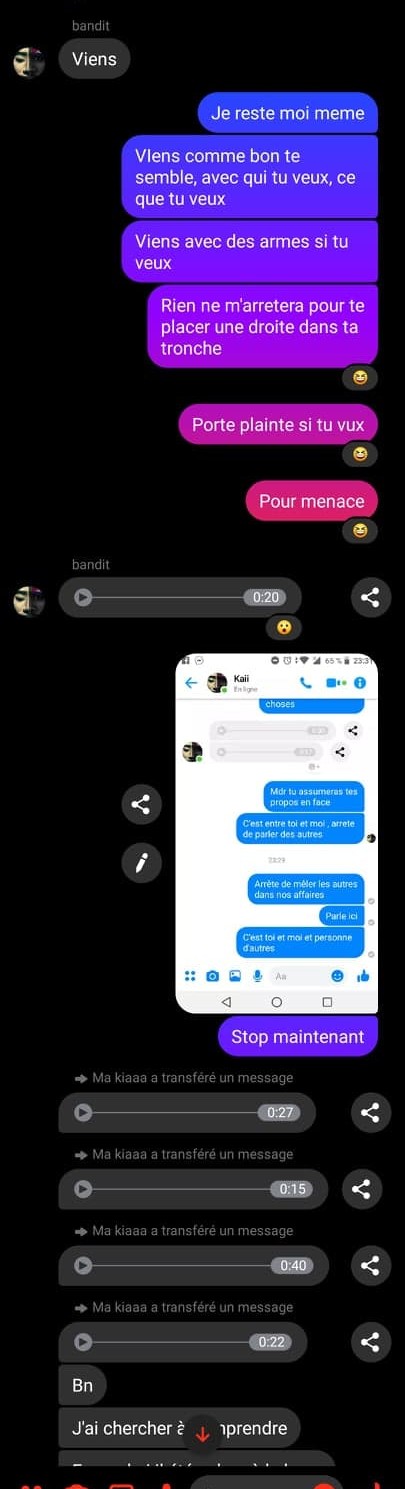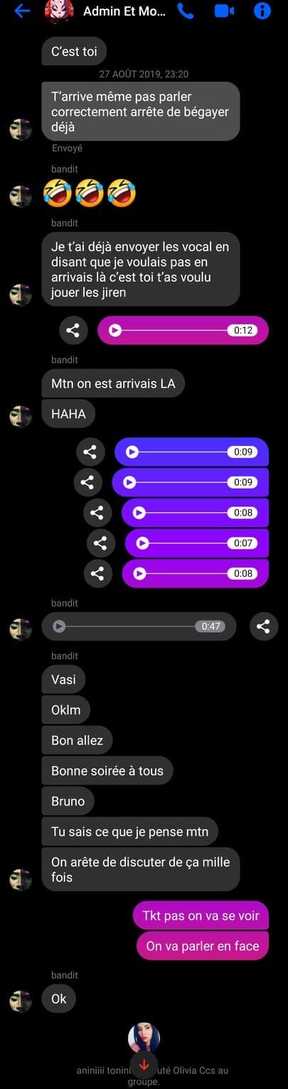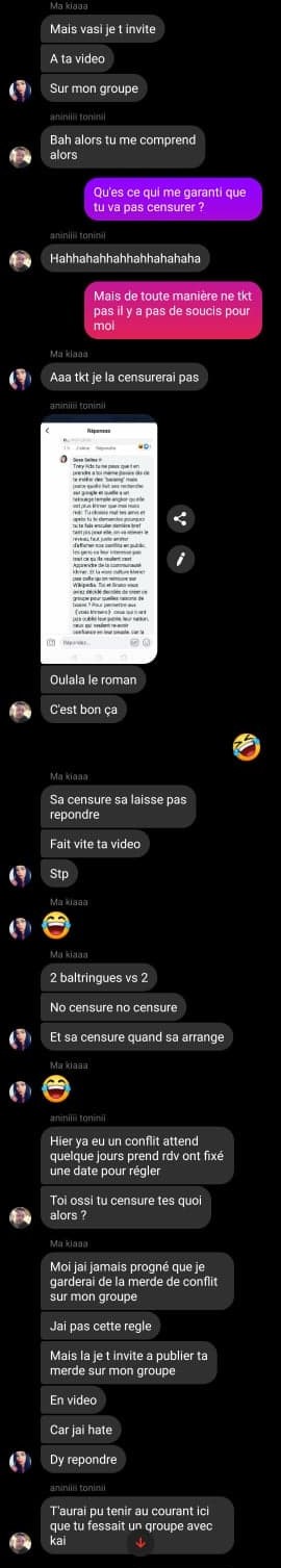 Voici quelques aperçu de message (sur messenger, je suis en bleu, en noir c'est Kai)