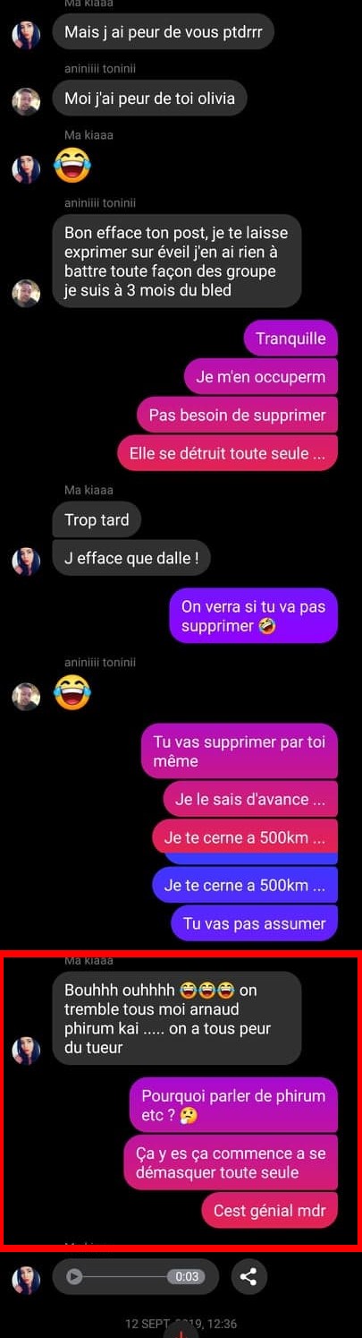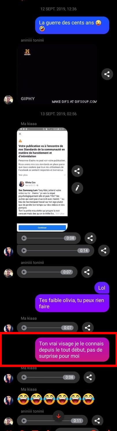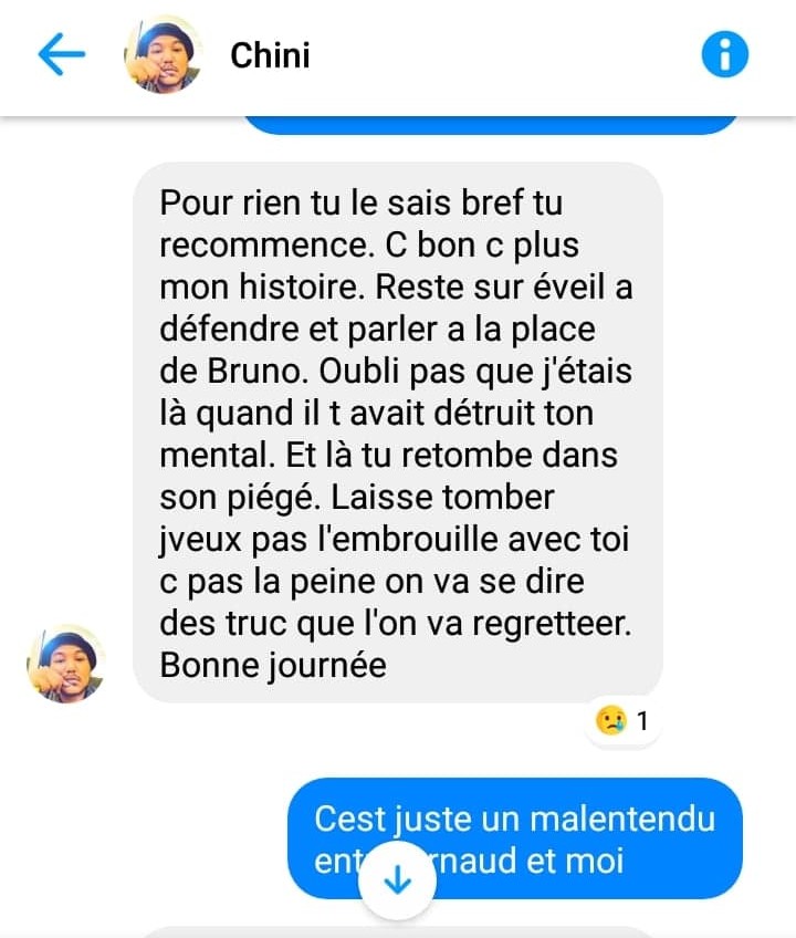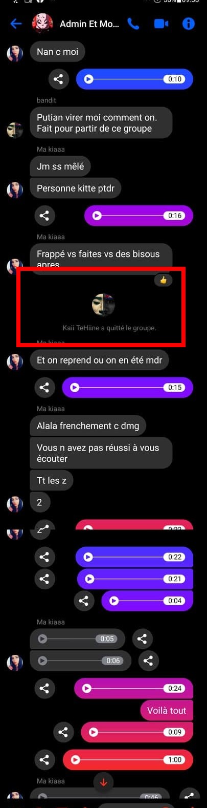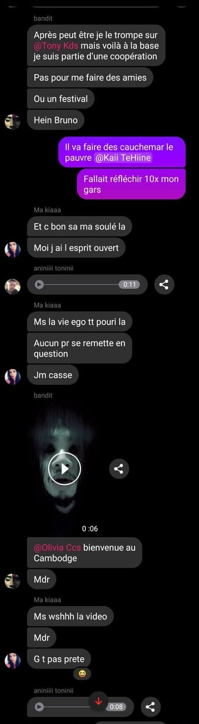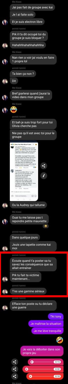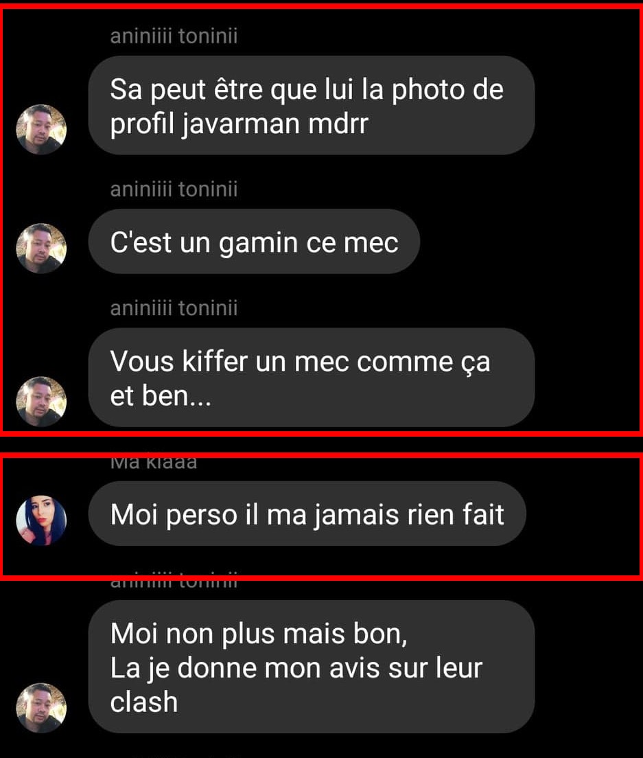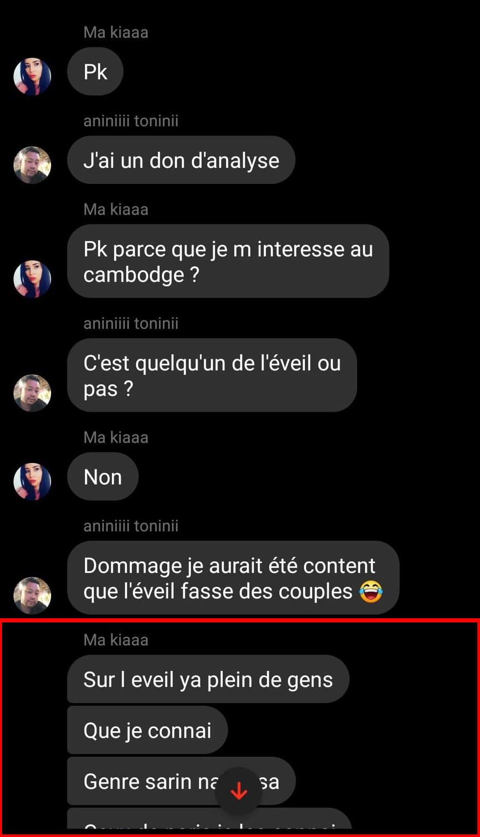 Voici quelques aperçu de message (sur messenger, je suis en bleu, en noir c'est Kai)