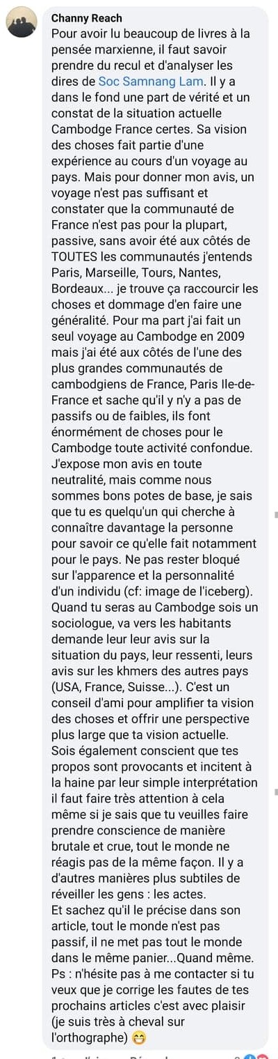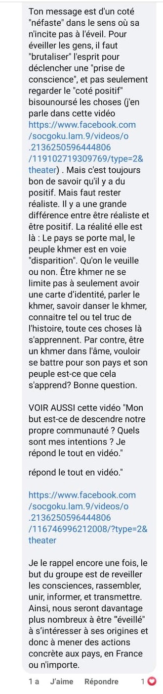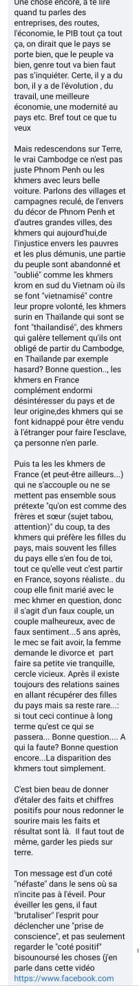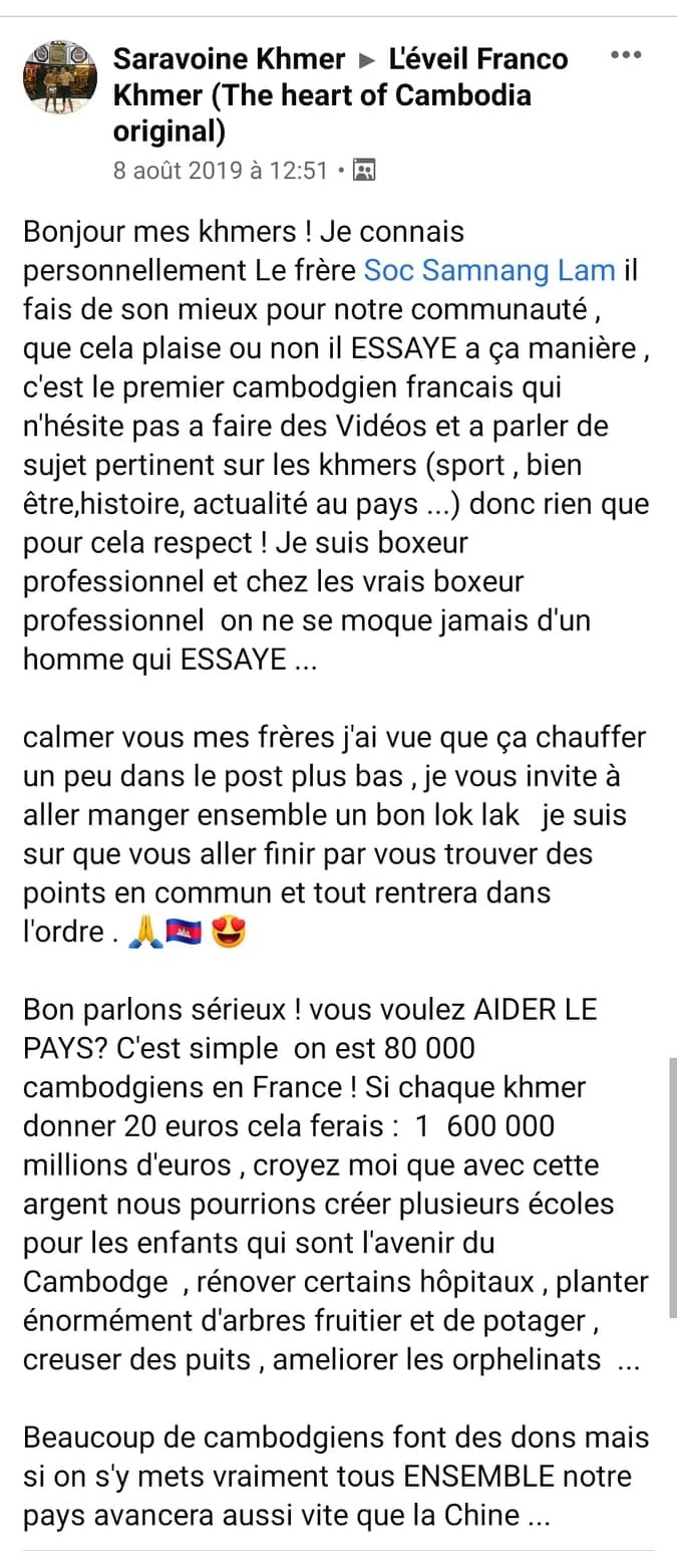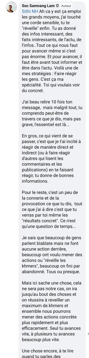 C'était une publication où ont expliquait comment trouver des solutions pour le Cambodge. J'expliquais que si on cotise tous ensemble (par exemple) pour une seul et même action concrète, précise et intelligente, on pouvait aller très loin ensemble. Et lui, commence à faire ses entendus, toujours de façon subtile. A sous entendre que notre but était politique (ce qui n'était pas le cas)