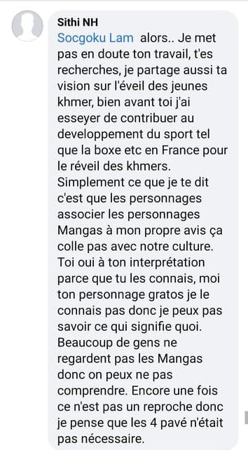 Mais ta son pote Sithi (on n'en reviendra après pour son cas à lui) qui fait une remarque hors sujet pour critiquer mon illustration sur la publication en question, il disait que mon illustration était un non respect envers notre culture et nos ancêtres que ceci n'avait rien n'avoir avec la culture khmer.