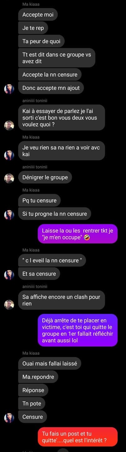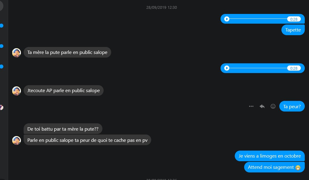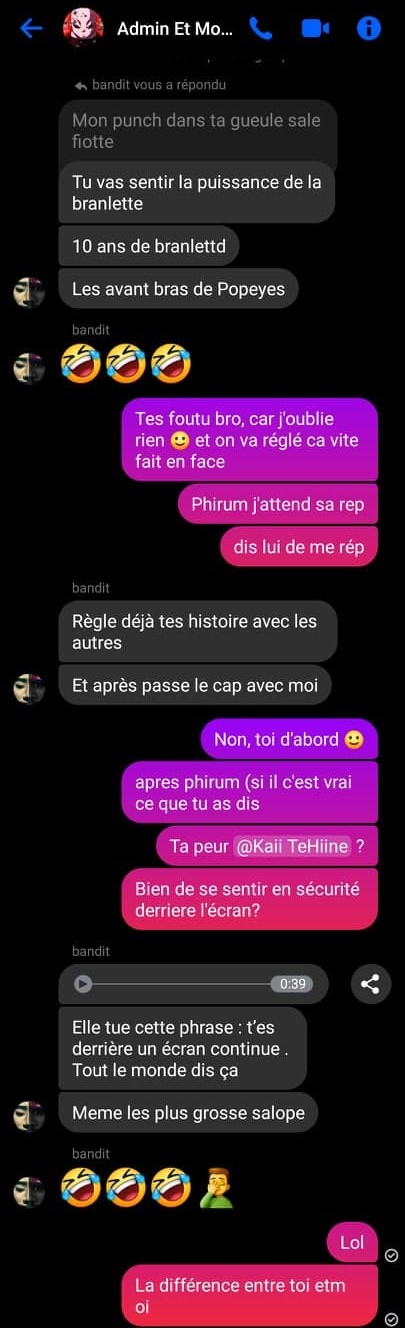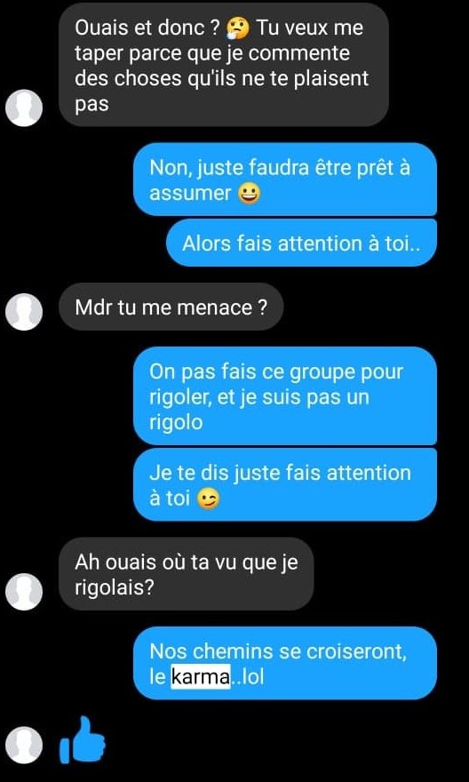 Sa se permet de provoquer et insulter sur internet, mais quand je propose de régler ça une bonne fois pour toute en face et de discuter en face il y a plus personne, ils se font ensuite passer pour des victimes et me mettent l'étiquette du grand méchant.