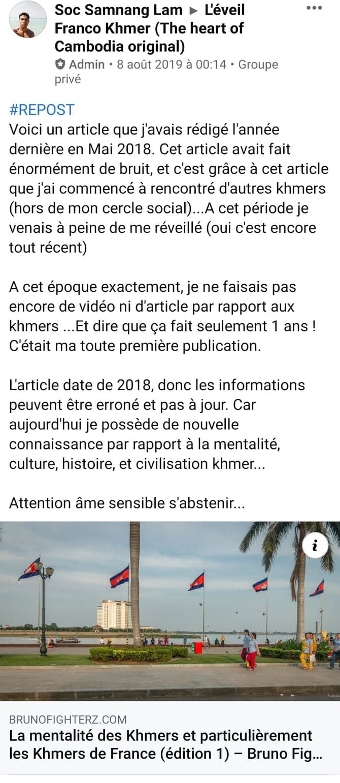 Alors, il faut savoir que ce Phirum est un troll de très longue date qui m'a observé depuis plus de 2 ans bien avant la création du groupe EVEIL FRANCO KHMER, il m'avait ajouté dans ses amis à la suite de mes articles postés dans le groupe KHMER D'ICI ET D'AILLEURS.