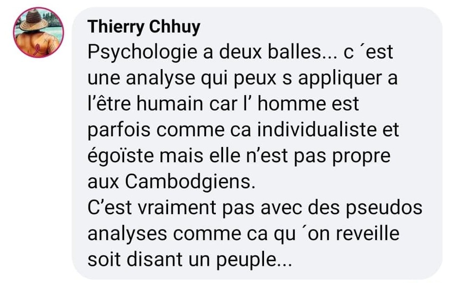 C'était dans une publication dans laquelle on parlait de la mentalité des khmers. C'est un sujet tabou qui fait souvent polémique et auquel beaucoup de gens n'osent pas en parler ouvertement en public.