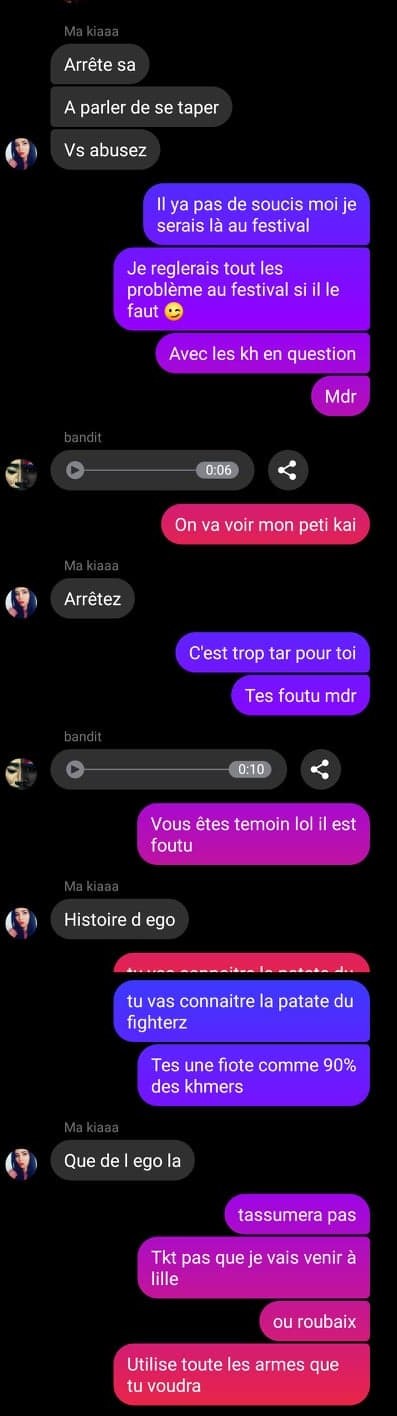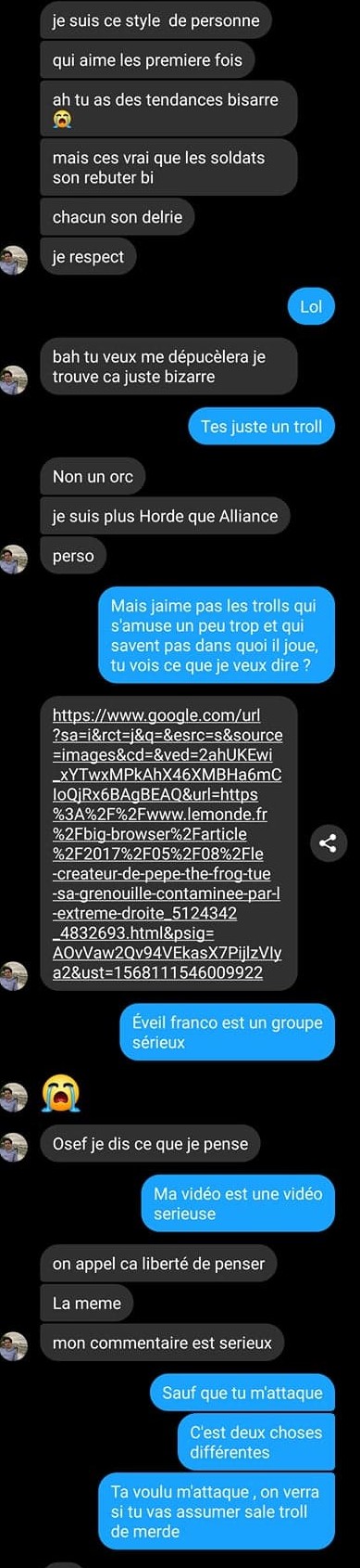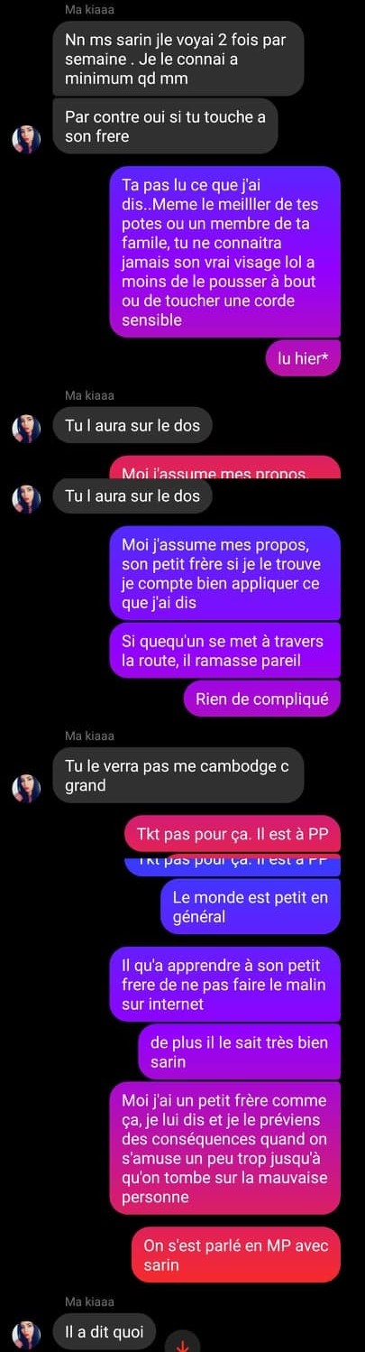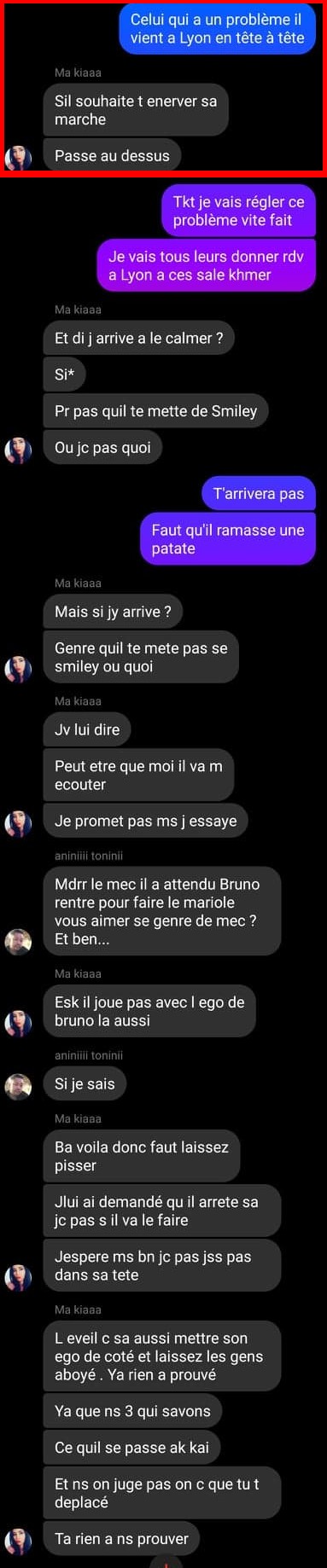 Il faut savoir que si j'ai été aussi agressif avec lui, non seulement à cause de sa paranoia mais c'est surtout que ses insultes à lui était du même niveau que Kai c'est à dire à base de "salope" ,"nike ta mere", etc