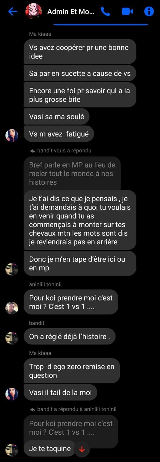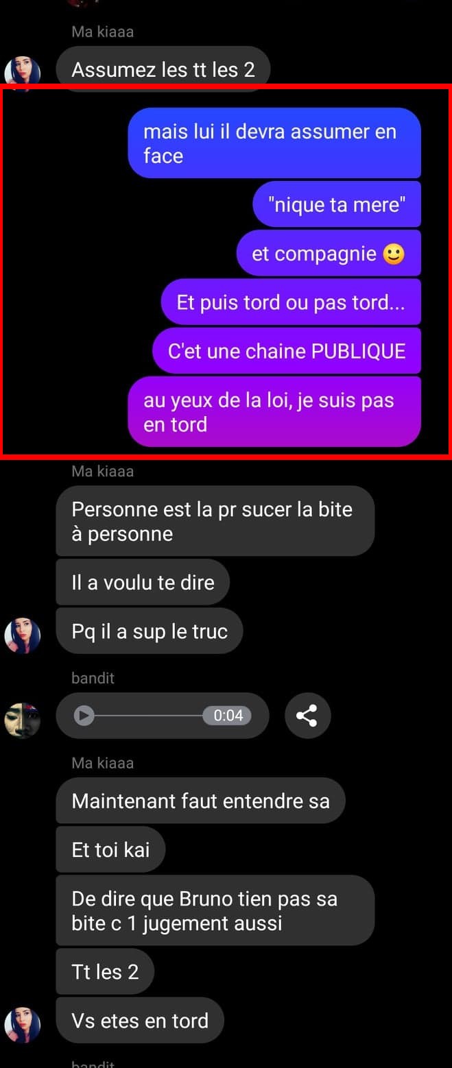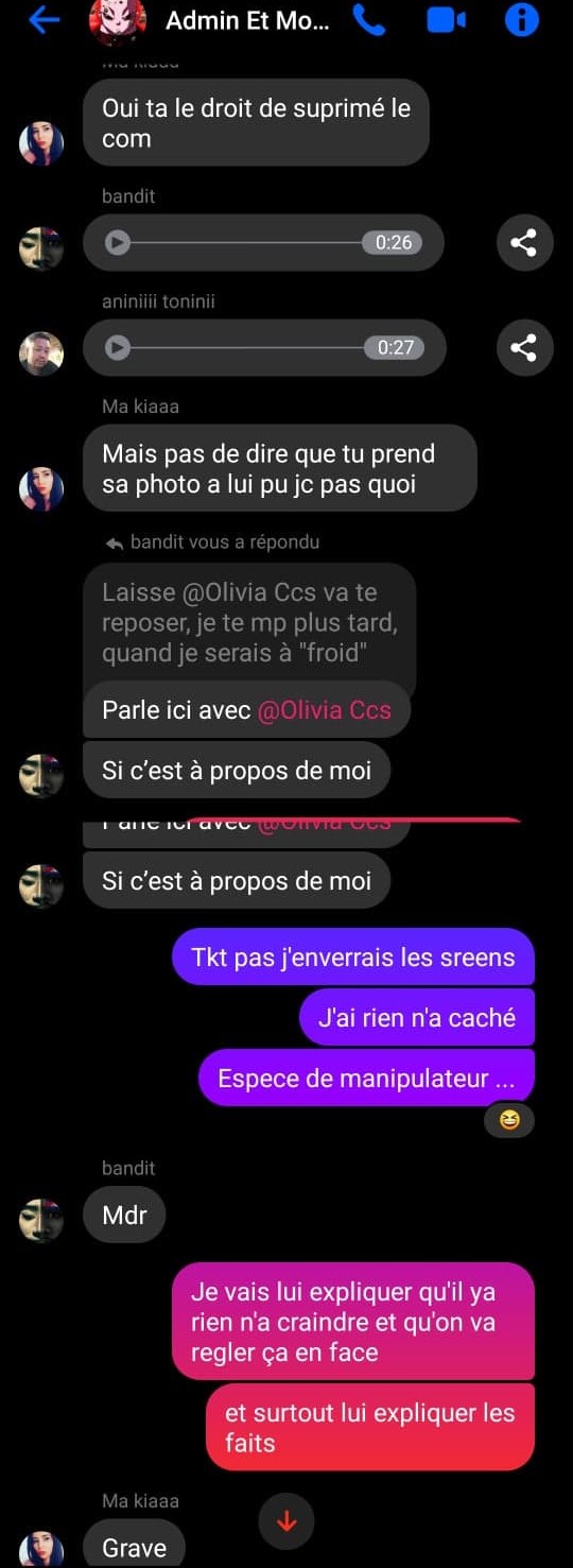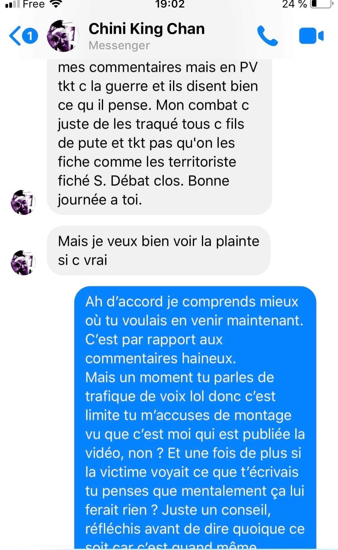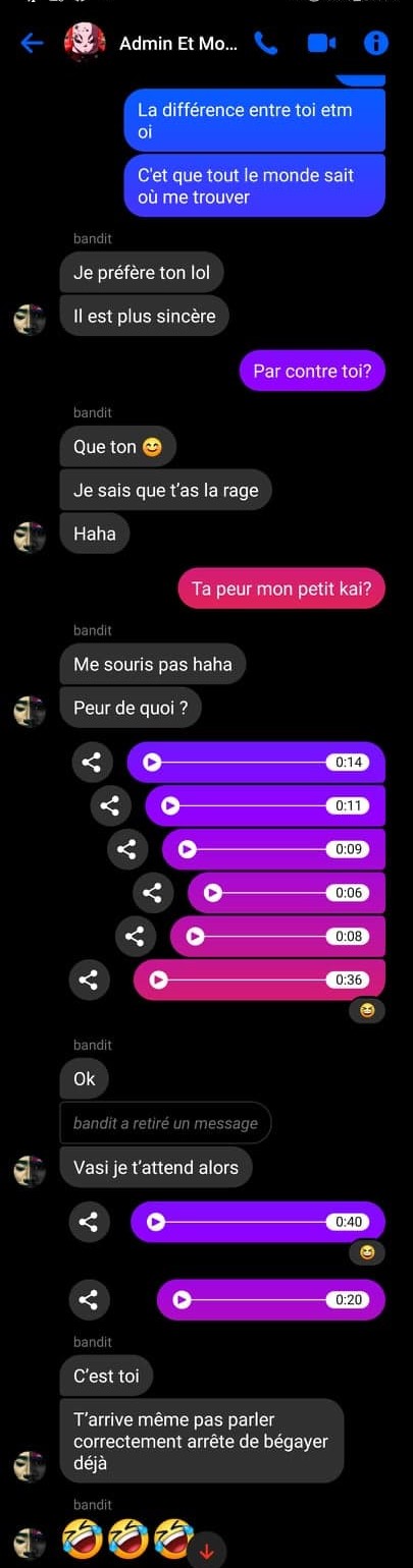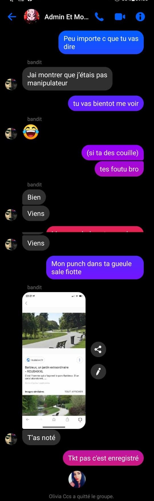 Si ce gars avait queqlue chose à me repprocher qu'il vient me parler en privée au lieu de faire sa fiotte et commenter partout pour me viser et me troller.