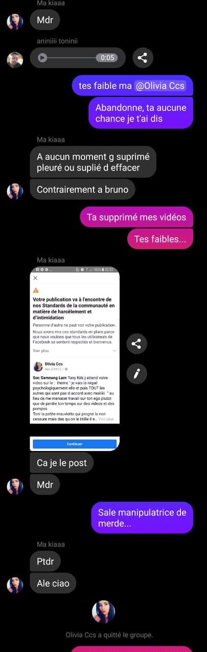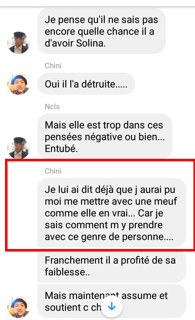Mais en vérité, c'est Chini qui a manipulé Solina en exploitant ses faiblesses, puisqu'elle était en embrouille avec moi. Du coup Chini a user de la manipulation pour lui faire croire que j'aggisais comme un khmer rouge et lui faire dire ce qu'il voulait lire pour en faire des preuves par la suite.