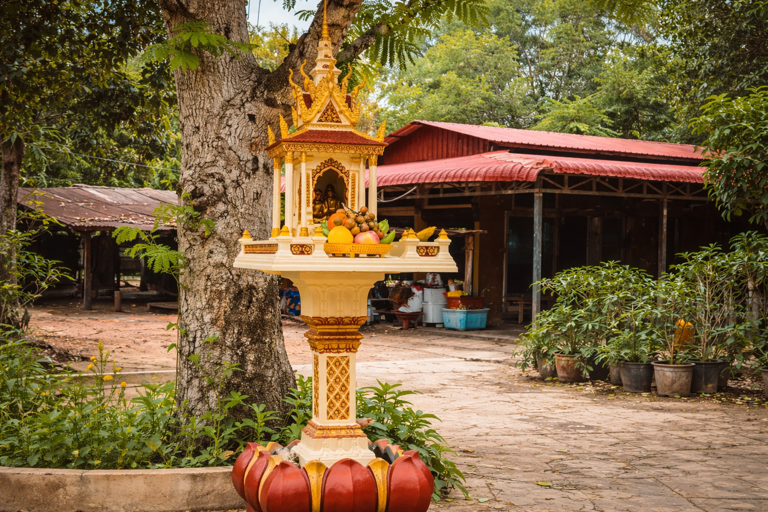 Même dans un Cambodge moderne, ce type de sanctuaire reste très présent dans les maisons, commerces, terrains familiaux et espaces sacrés.