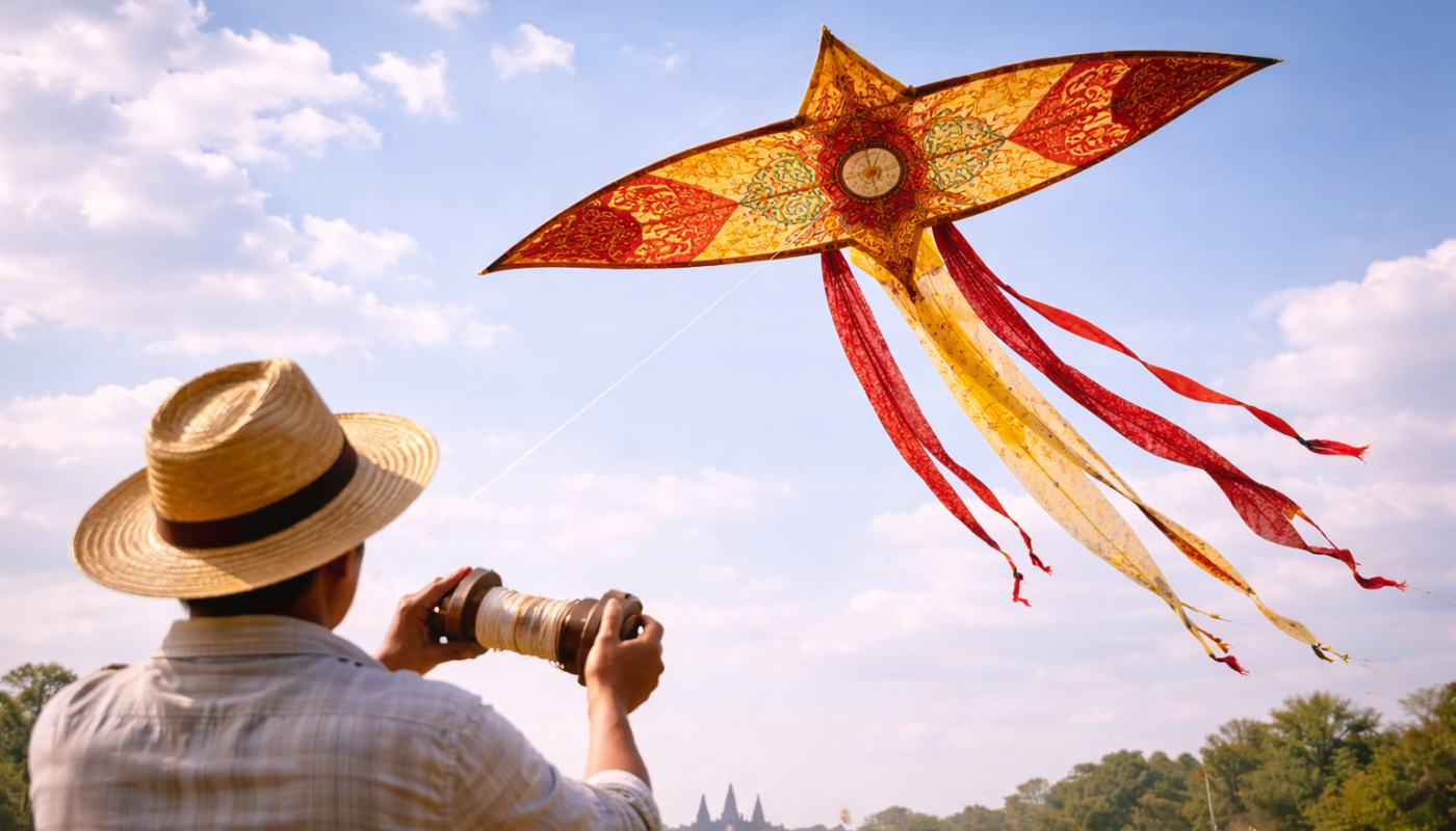 Les cerfs-volants traditionnels khmers, appelés Khleng Ek, ne sont pas de simples jouets : ils font partie d’une ancienne pratique culturelle liée aux rites agricoles et à la connexion avec les ancêtres. Ces cerfs-volants sont souvent fabriqués à la main, avec des matériaux comme le bambou, et intègrent une petite structure capable de produire un son caractéristique lorsque l’air circule, une façon symbolique d’honorer les esprits et de célébrer les saisons.