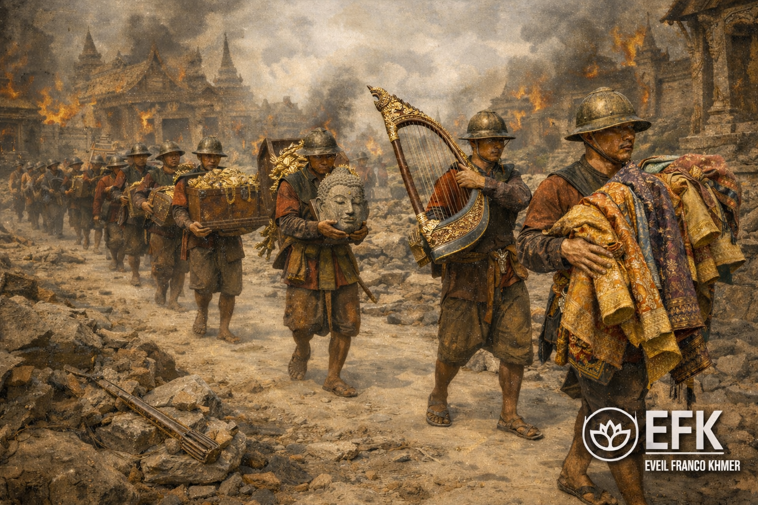 Une partie de la famille royale khmère est capturée et transférée à Ayutthaya. Dans le contexte politique de l’époque, ces déportations ont un objectif clair : contrôler le royaume vaincu en gardant ses élites sous surveillance.