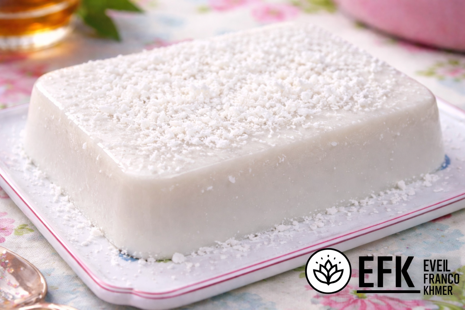 Parmi les douceurs les plus reconnaissables de la culture khmère, il y a ce dessert simple en apparence, coupé en petits cubes blancs et translucides, à la texture souple entre gelée et flan léger. Très apprécié pour sa fraîcheur, il évoque immédiatement les desserts au lait de coco servis bien froids lors des repas de famille, des fêtes et des journées chaudes.